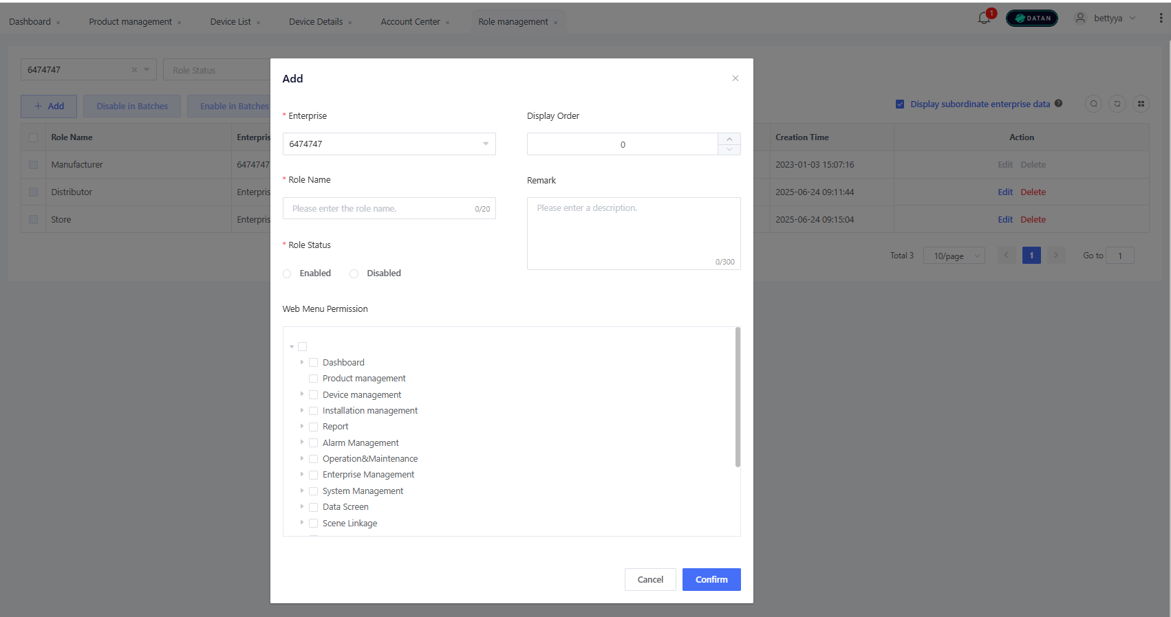 You must create a role before creating a sub-account, and the role is used to define the menu access permissions for the sub-account. Go to “Enterprise” > “Role”, click “Add”, and complete the information: “Role Name” (e.g., Administrator, Maintenance technician, Installation personnel), “Role Status” (default: “Enabled”; can be set to “Disabled” if no longer used), and “Web Menu Permissions” (different roles can have different permission levels based on job responsibilities).