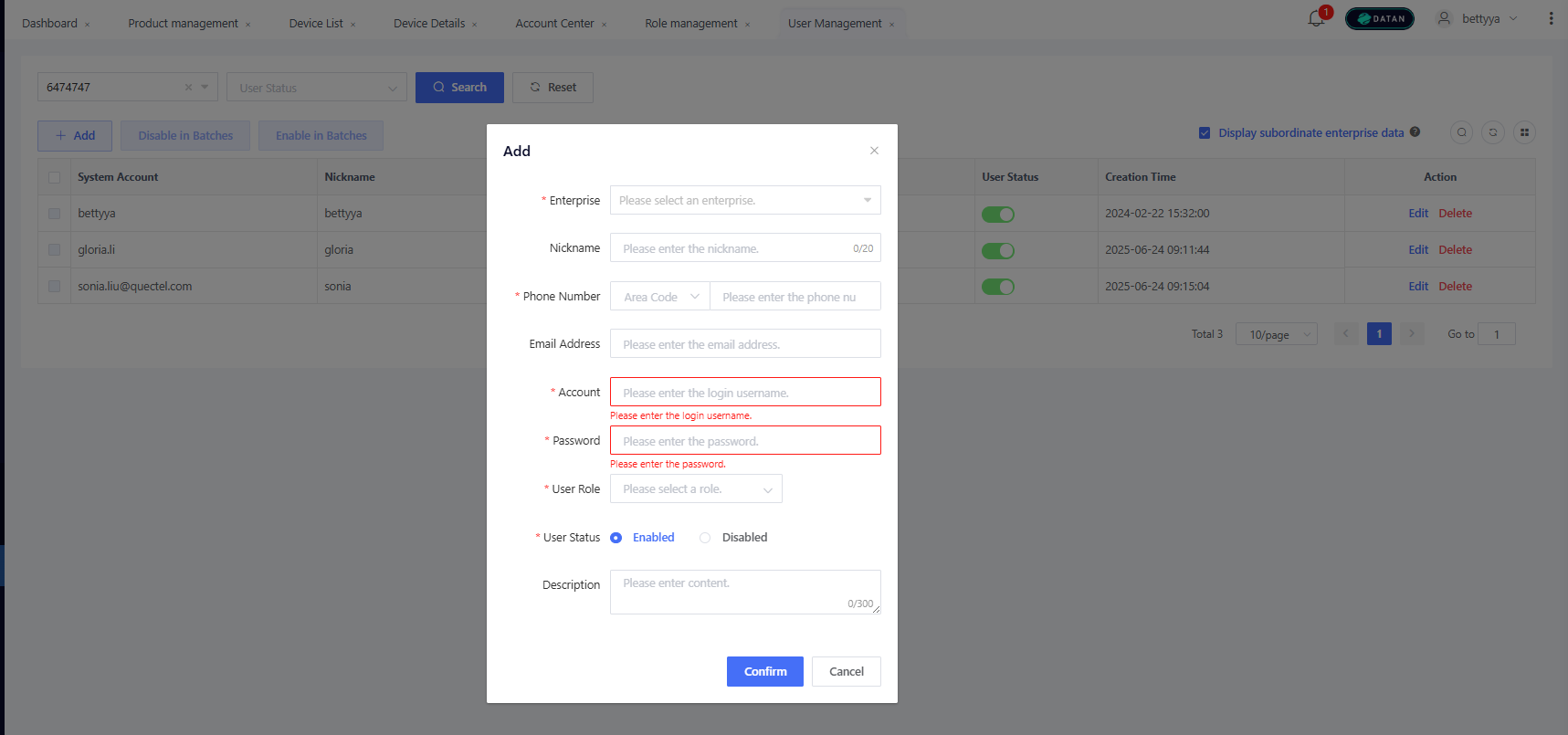 Go to “Enterprise” > “User”, click “Add”, and complete the information. Enterprise: Select the enterprise to which the user belongs. Upper-level enterprises can create sub-accounts for lower-level enterprises. Nickname: Name of the user (e.g., John, Lucy). Phone Number: Area code + phone number Email Address: Optional. If both phone number and email address are provided, password recovery will prioritize email notifications. Account: Unique login identifier with 6-150 characters in length. An account may contain letters, digits, or characters (.-_@) and cannot start or end with a special character. User Role: A role created in the previous step to assign menu access permissions. User Status: Default to “Enabled”; can be set to “Disabled” if the user is no longer used.