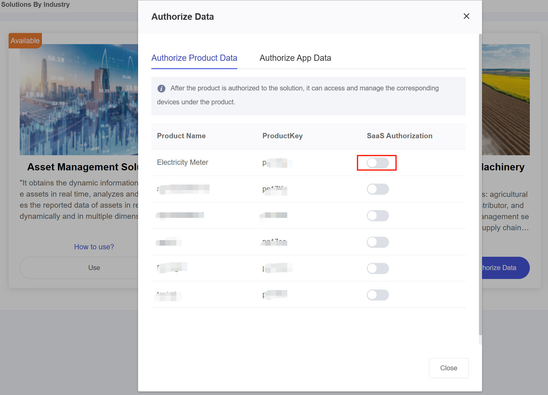 Product configuration enables business-specific settings for products created in Developer Center. Before configuring a product, you must first authorize data for the Asset Management Solution under “Solutions By Industry” in Developer Center. Click "Authorize Data", and select the products that need to be managed in AMP for authorization.