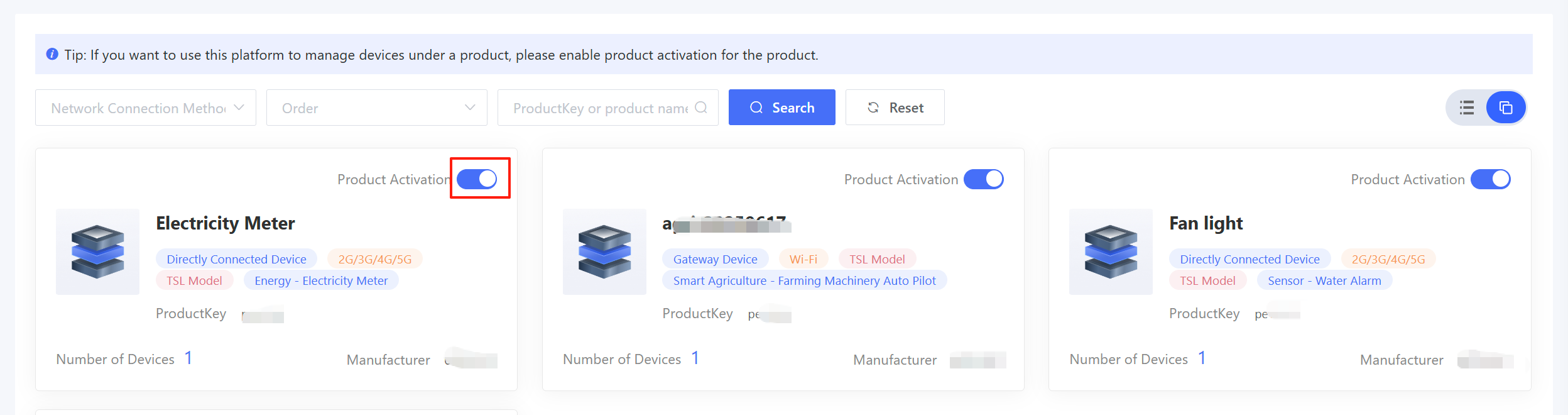 Products that have been authorized will be displayed in the “Product” menu of AMP. To manage devices under these products, ensure the “Product Activation” switch is turned on. Activating the product means the platform will subscribe to product messages, enabling real-time device data updates.