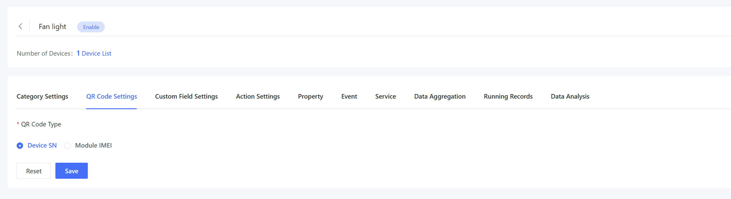 Only the device SN QR code is currently supported. The system generates the QR code by combining a unique Serial Number with ProductKey. The QR code is secure as it hides the module IMEI but requires the production line to support SN-IMEI binding.