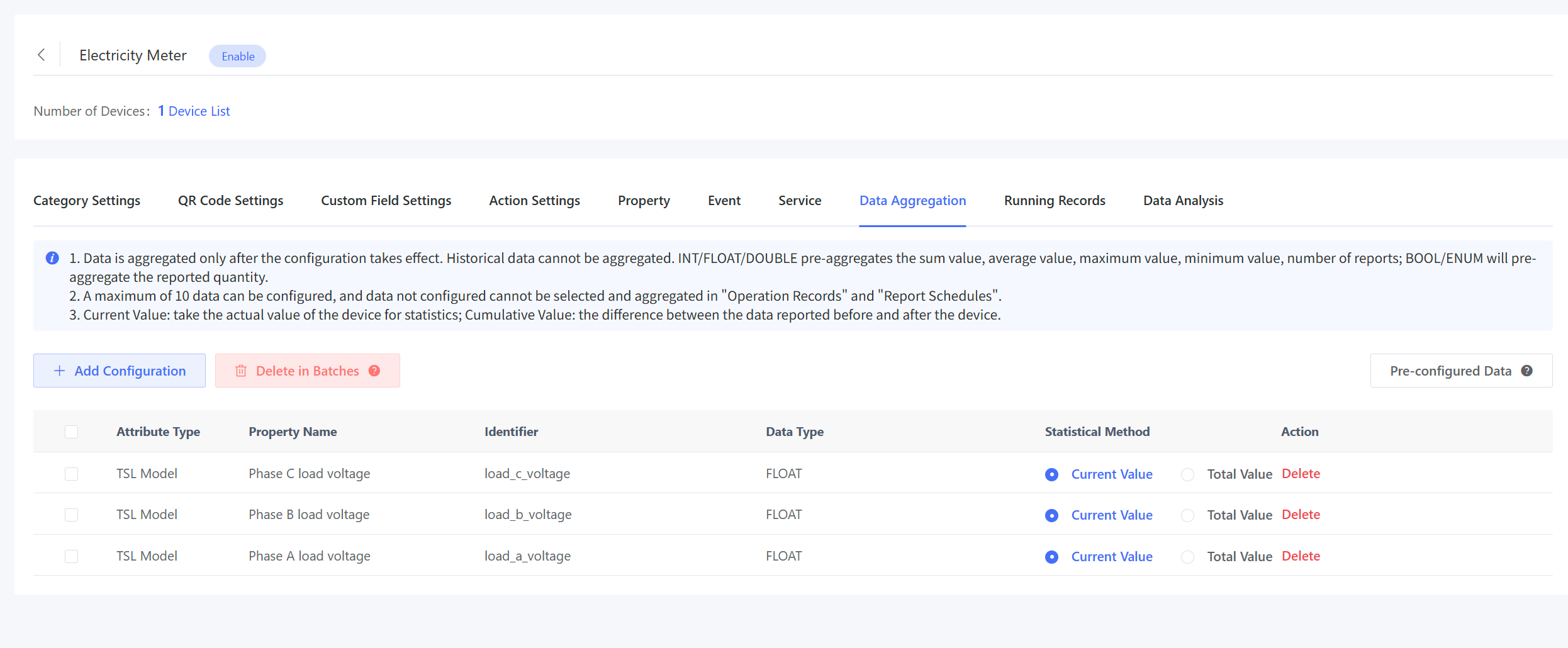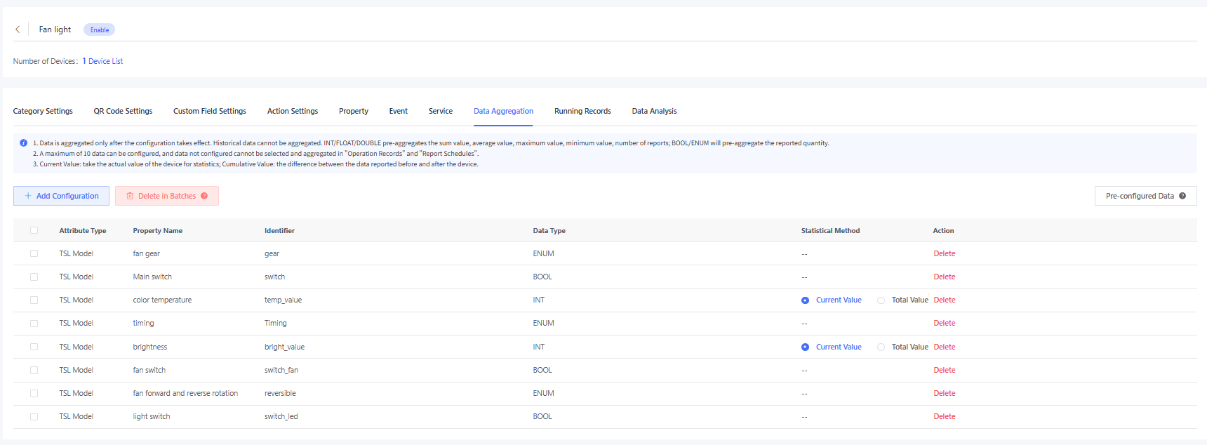This feature is used to configure data sources for aggregation statistics. This feature must be completed before setting up Operation Records or Aggregation Reports. Different data types are aggregated differently. Data in INT/FLOAT/DOUBLE type is pre-aggregated for the sum value, average value, maximum value, minimum value, and number of reports; Data in BOOL/ENUM type will be pre-aggregated for the number of reports. Data is aggregated only after the configuration takes effect. Historical data cannot be aggregated.