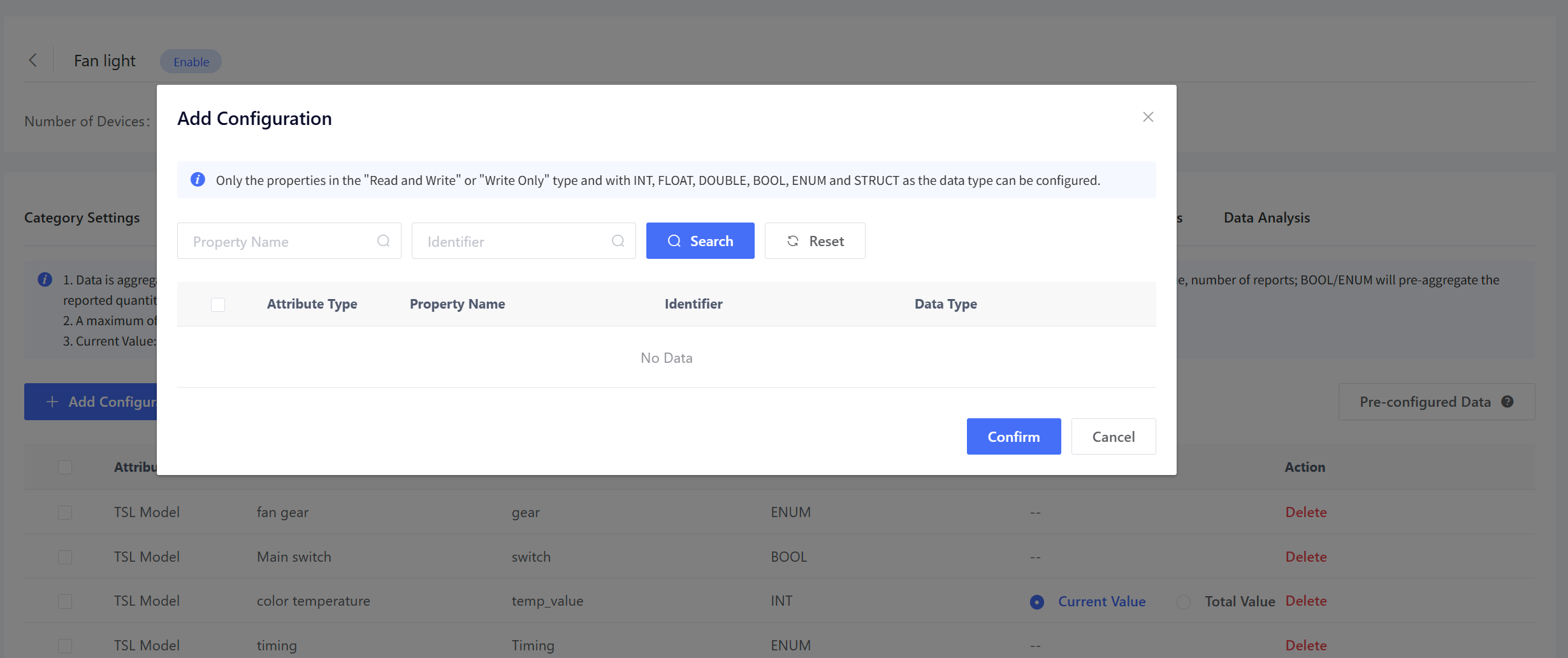 Click “Add Configuration” and select the TSL model features to be aggregated in the pop-up window.