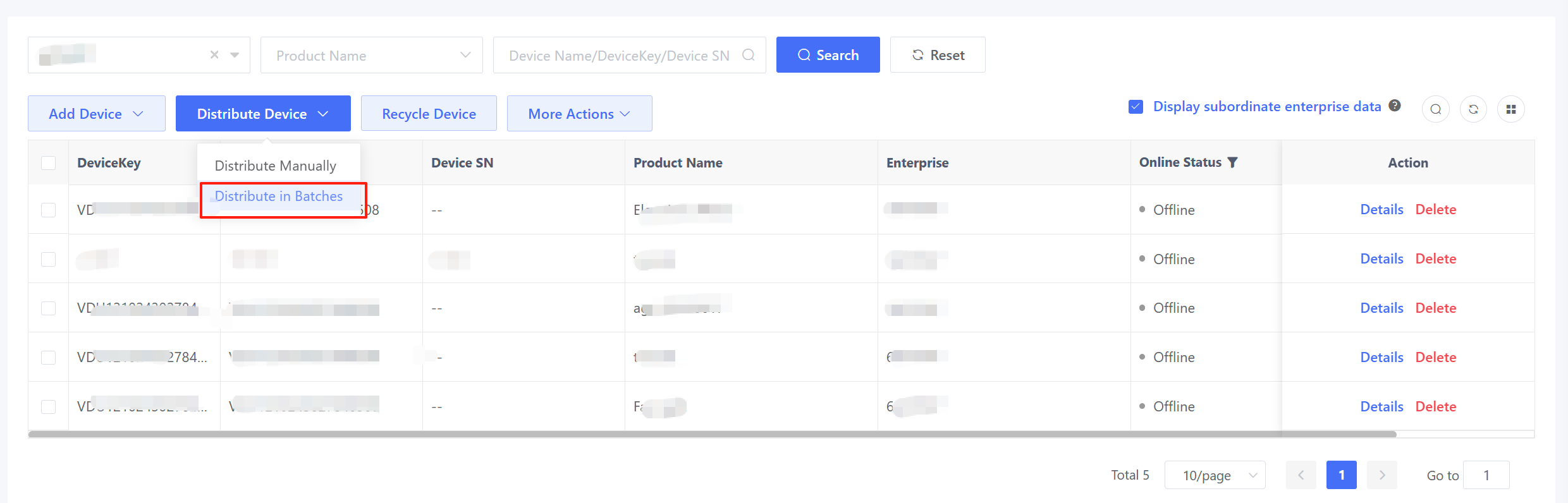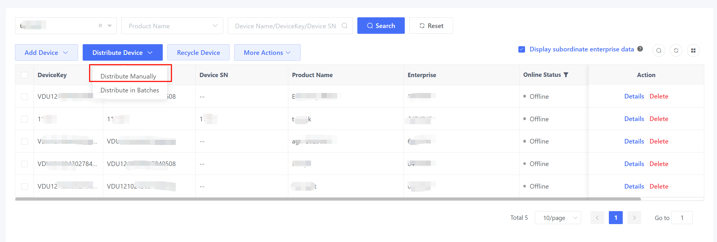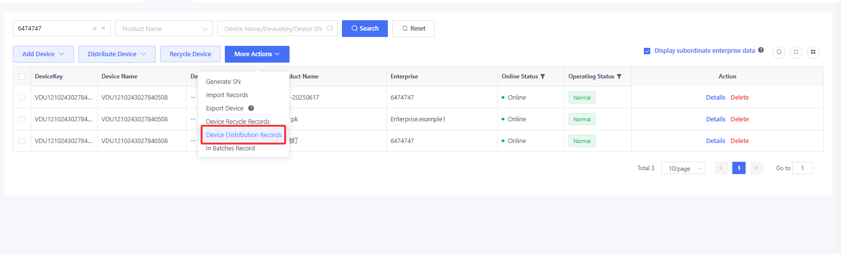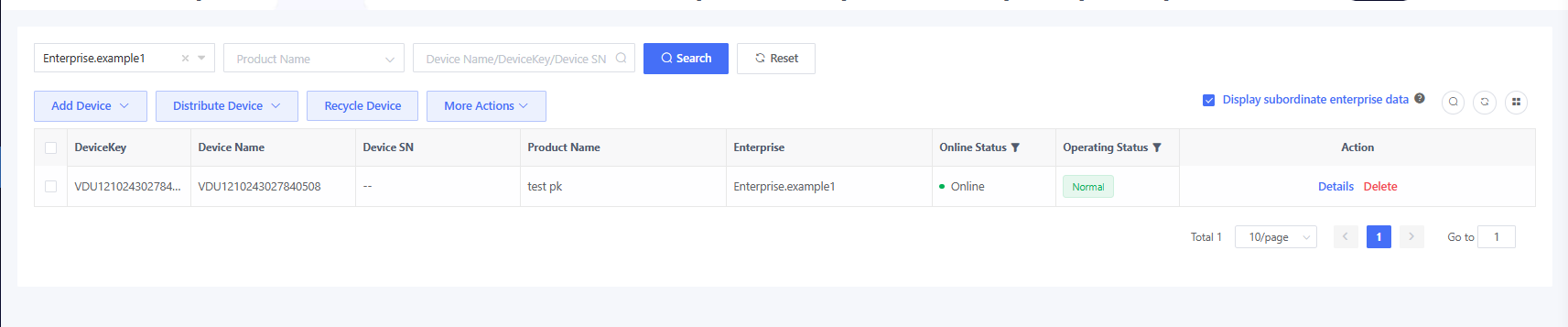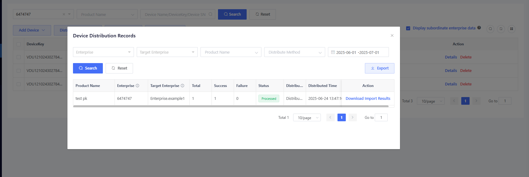 After importing devices into the platform, you can distribute them to subordinate enterprises based on sales orders. After the distribution, the subordinate enterprise gains management rights over those devices.