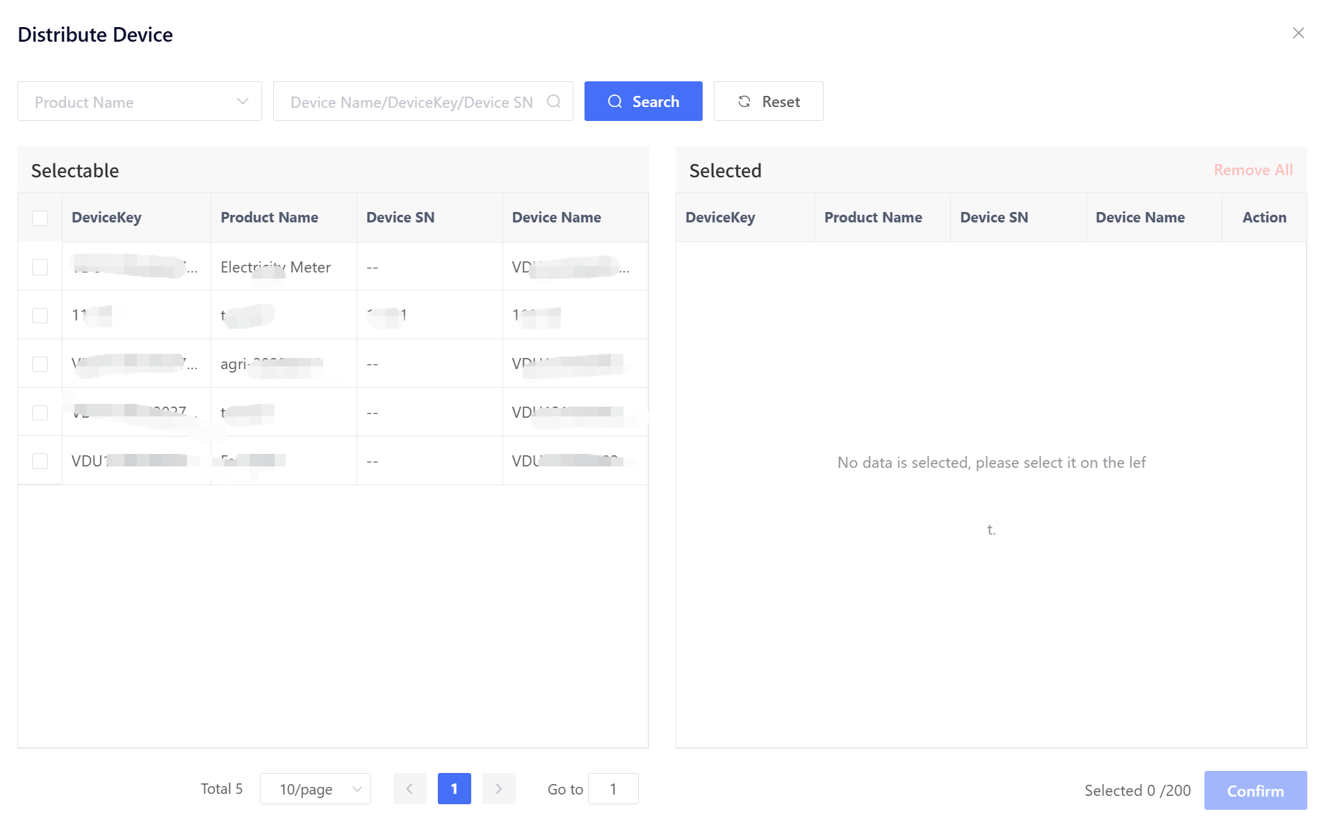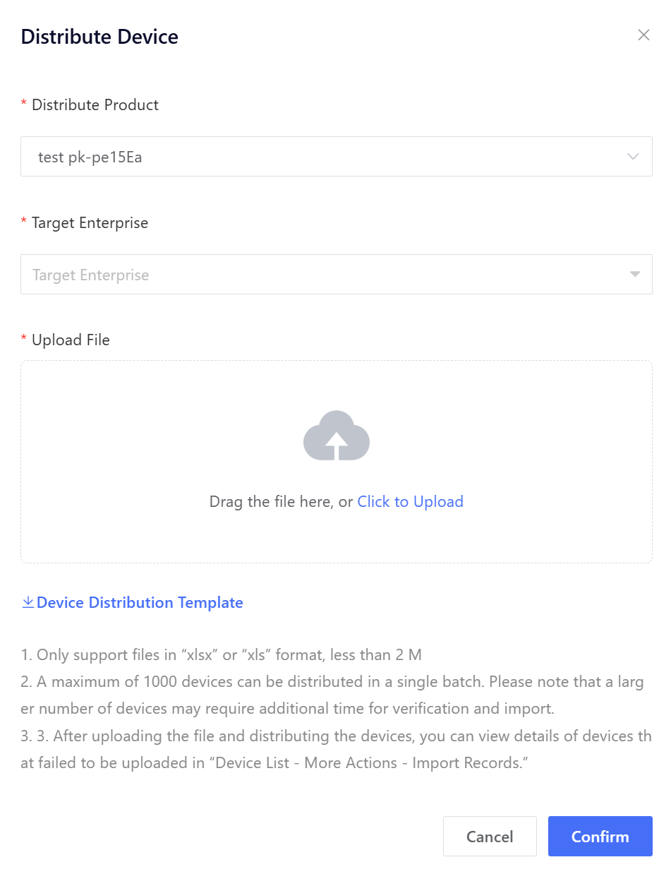 Click “Distribute Device” > “Distribute in Batches” to pop up the “Distribute Device” window. Select the product and the target enterprise, upload the device distribution file, and click “Confirm” to complete the distribution.