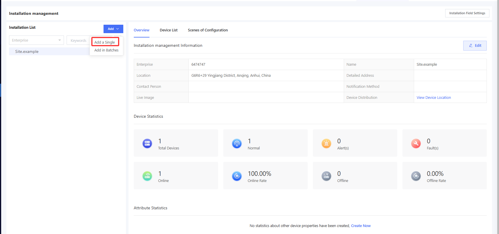 Click “Installation” in the left navigation bar, and click “Add” > “Add a Single” to pop up the “Add Installation Site” window.