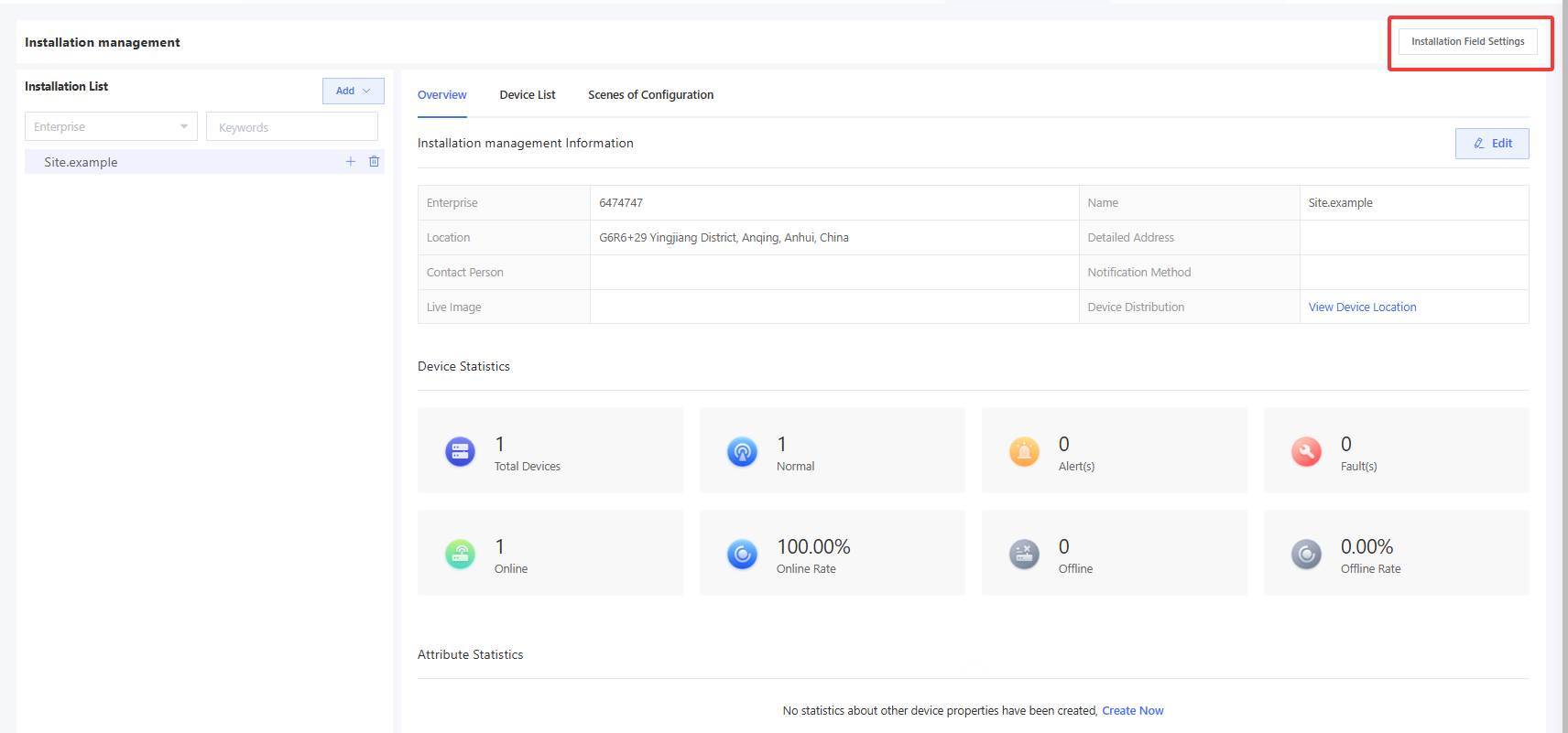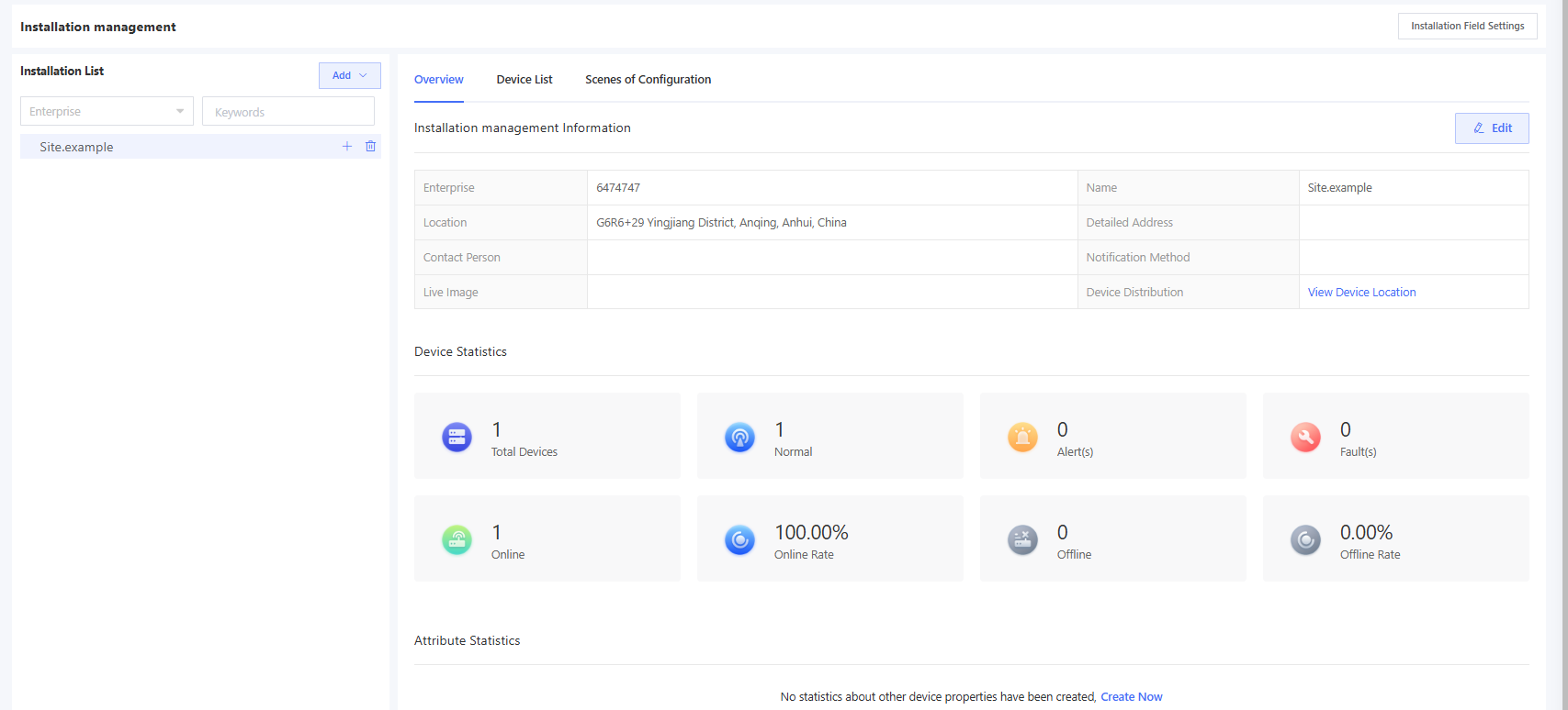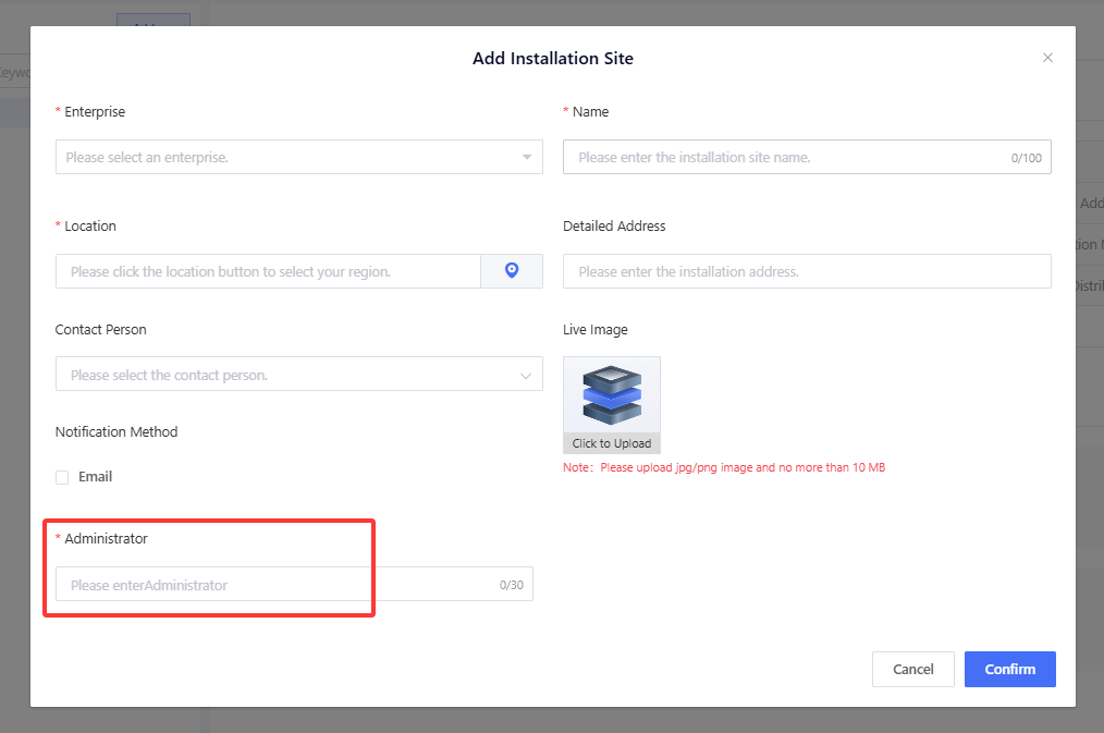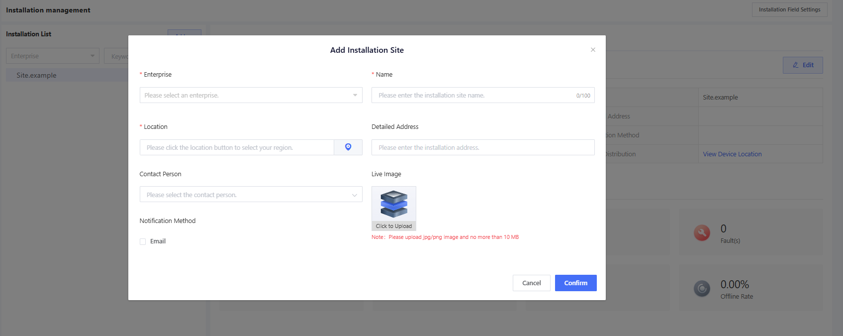 Enterprise: Select the enterprise to which this installation site belongs. Only devices under this enterprise can be bound to the installation site. Name: The name of the installation site. Location + Detailed Address: Specify the exact geographic location of the installation site. Contact person: Select the contact person associated with this installation site. When devices under this installation site generate fault alerts, the selected contact person will be notified. Add the contact person via Alarm - Alarm Contact. Notification Method: Select how the contact person will be notified when a device generates a fault alert. Only email is supported now. Live Image: Upload installation site photos.