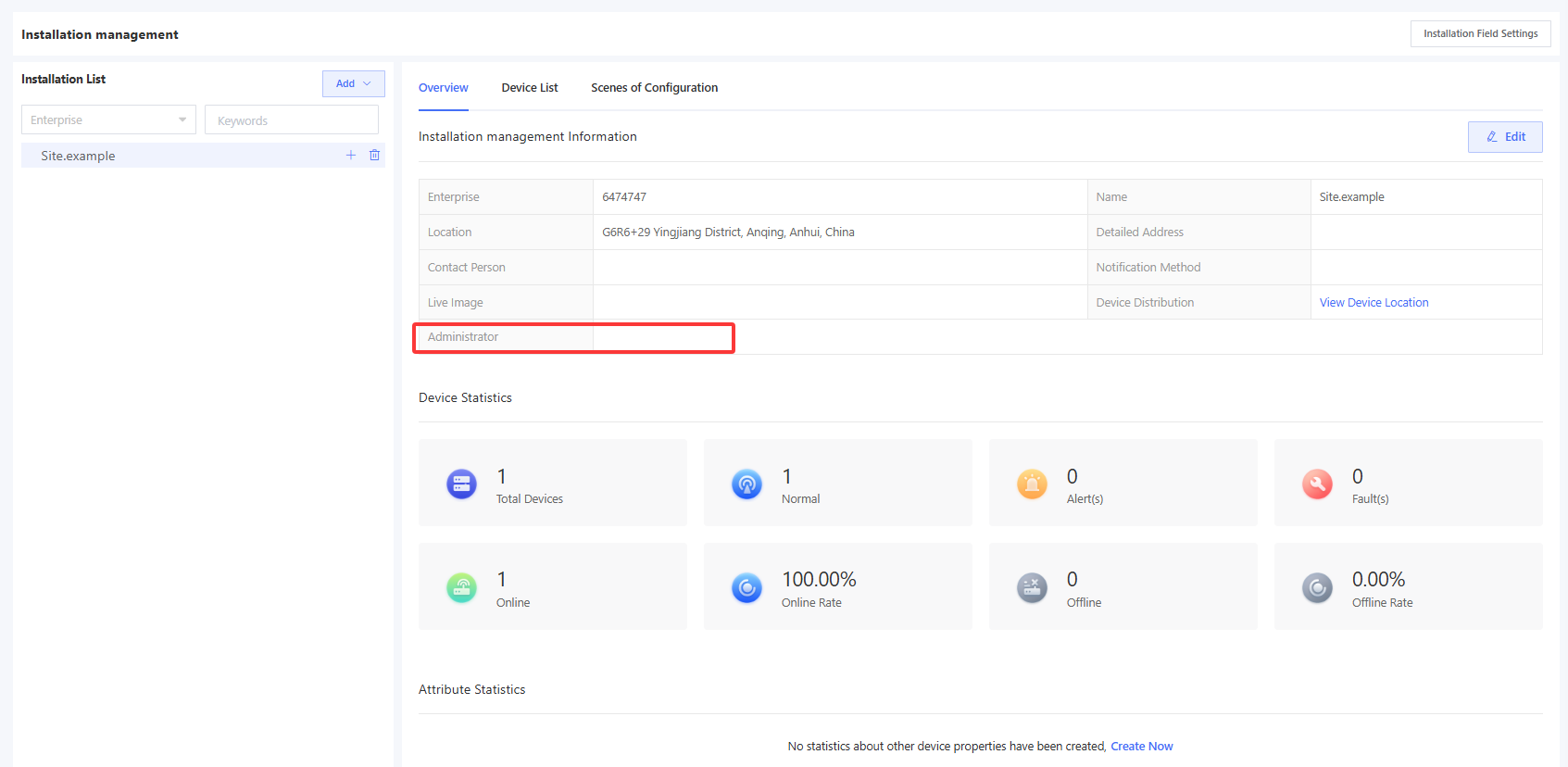 After you add the field, the “Administrator” input box will be displayed in the "Add Installation Site" window, and the entered value will also be visible in the installation site details.