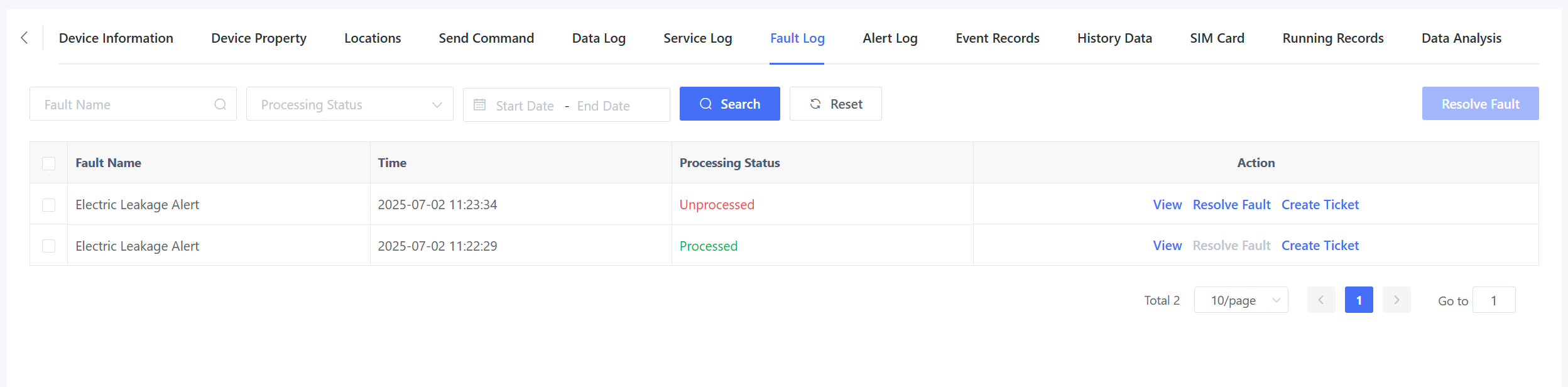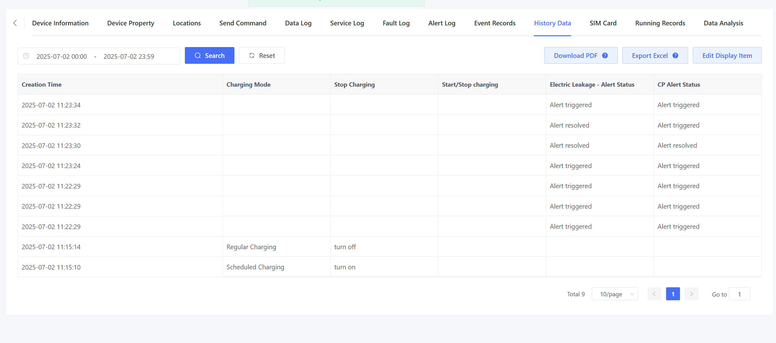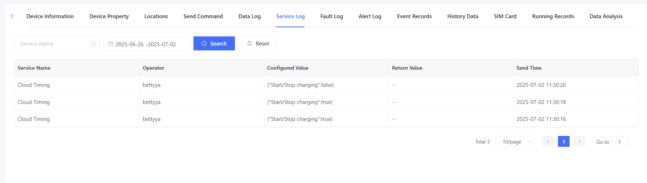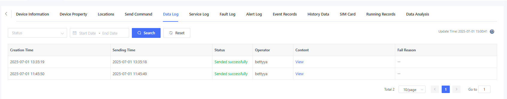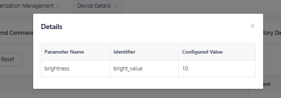 Go to “Device Details” > “Data Log” page to view records of property controls sent from the platform. Click “View” to check the specific parameter in each command.
