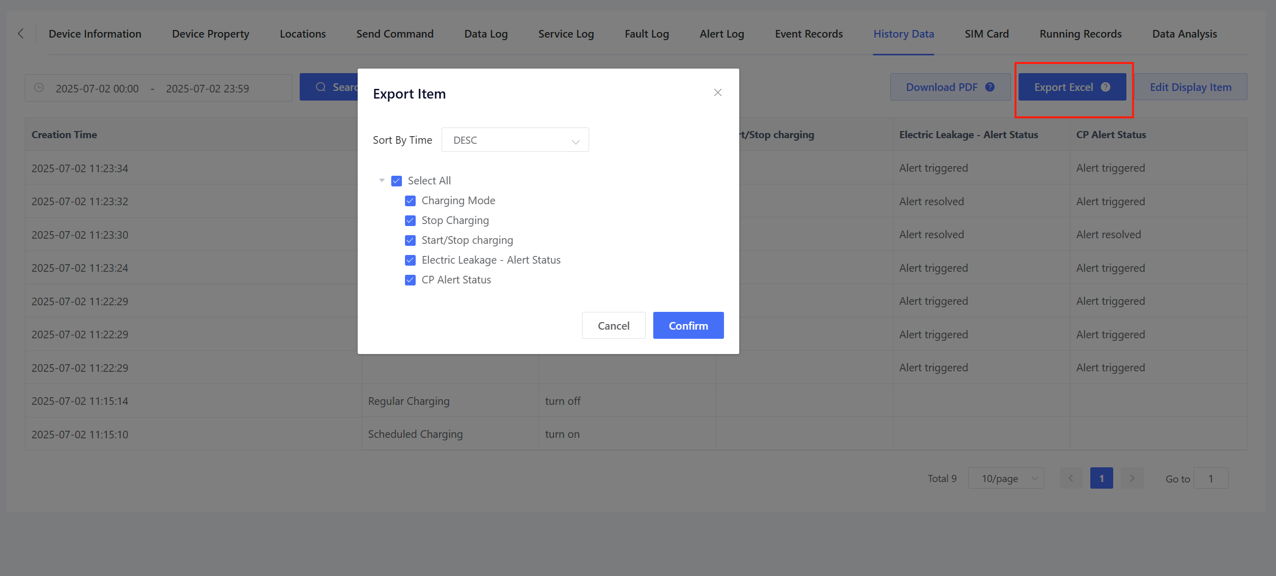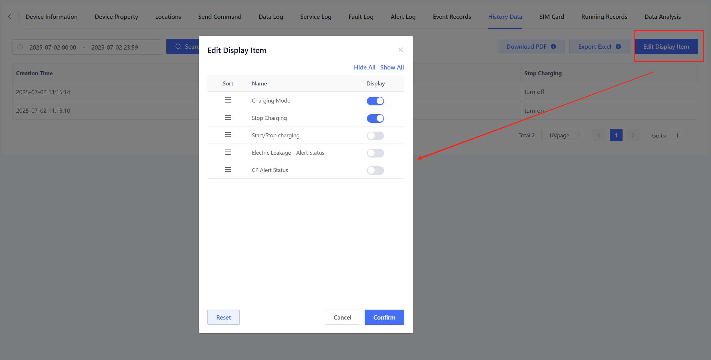Since different products may have different numbers of TSL model features and display requirements, you can select which models to display. Click “Edit Display Item”, select the desired TSL model features, and save the settings. Only the selected features will be displayed in the history data lis