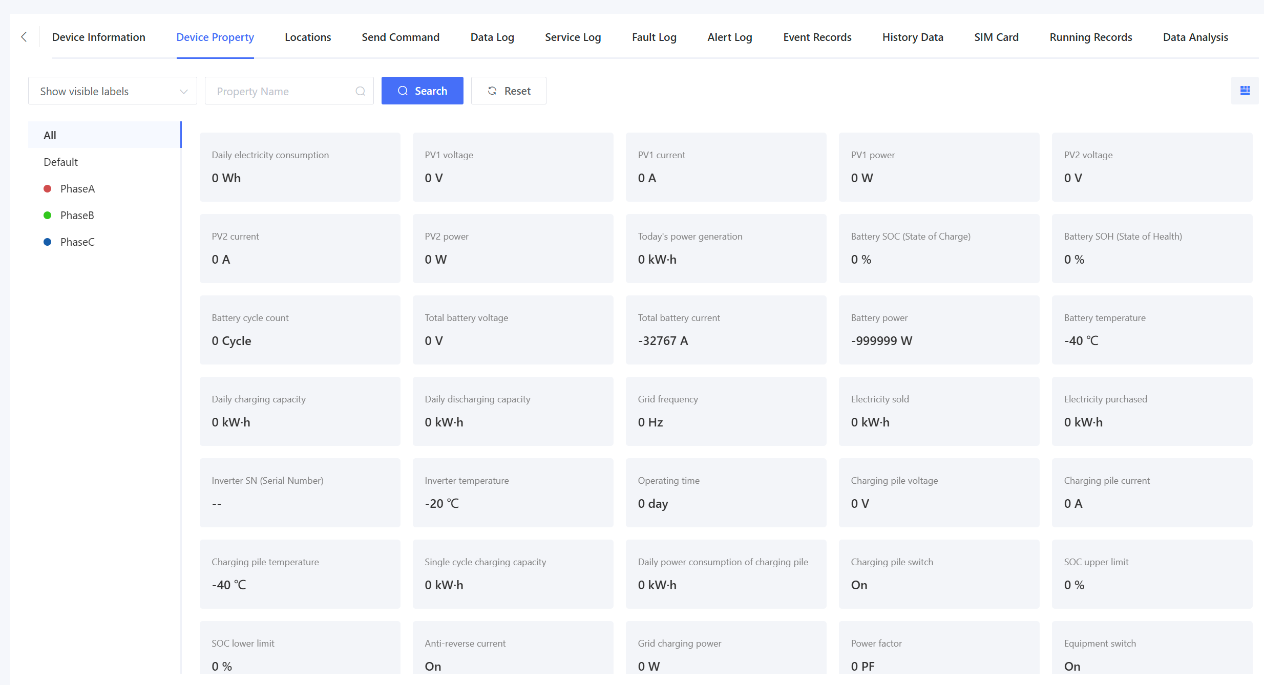 Display the latest TSL property data reported by the device. The data is categorized by labels. For configuration details, please refer to Product Settings - Property.