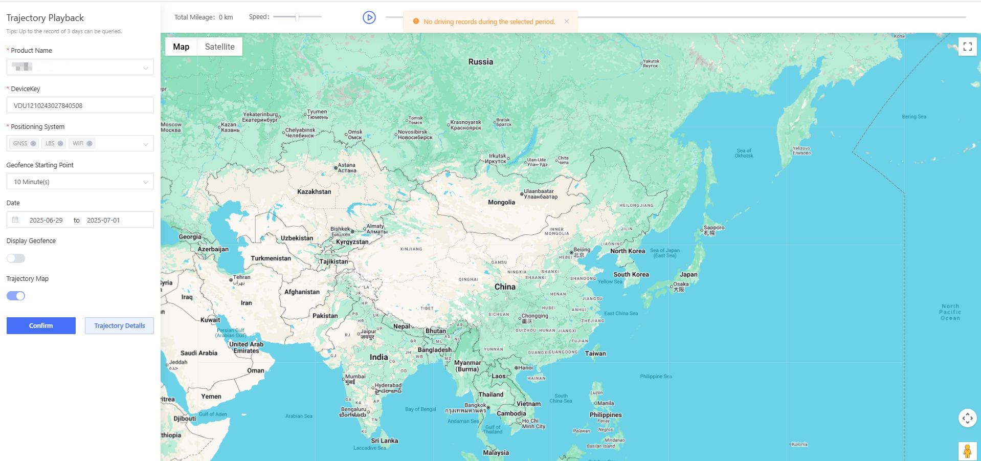 Click “Trajectory Playback” to view the device's historical movement route. Click “Mileage Report” to view the device’s travel distance logs.