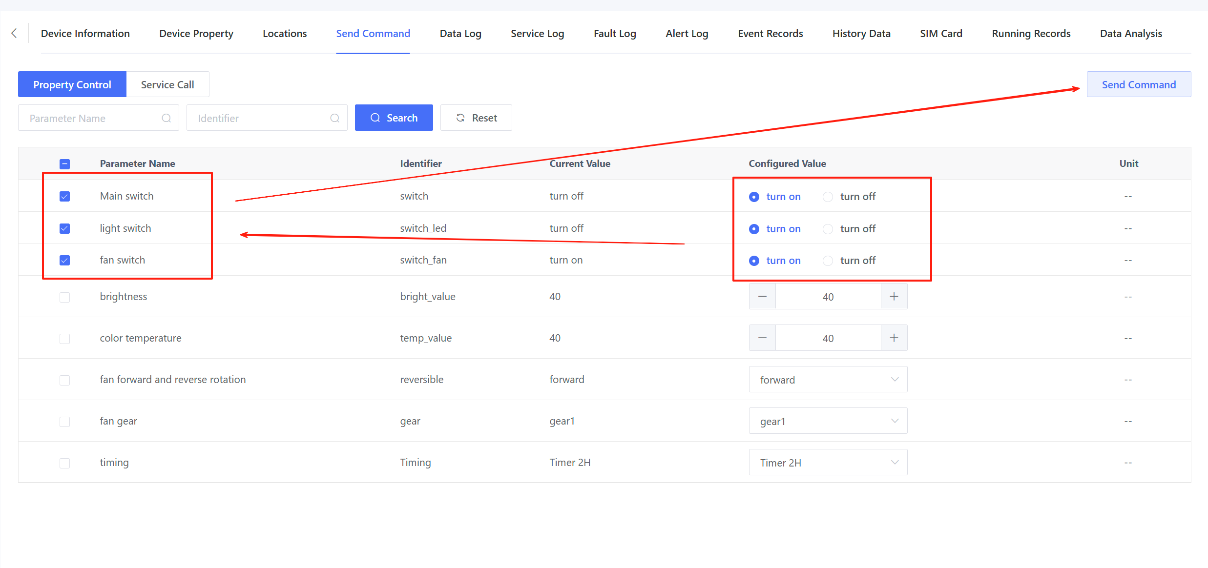 List writable TSL properties. Set the desired parameter values, check the corresponding parameters, and click “Send Command” to send commands to the device for remote control.