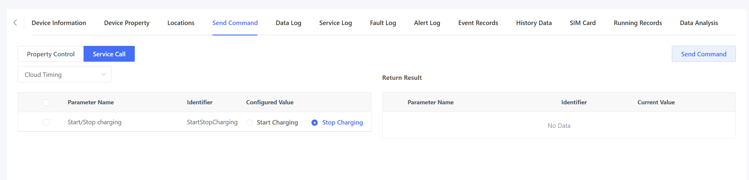 Command sending supports both property control and service calls. Service call allows sending commands and displaying the return values from the device.