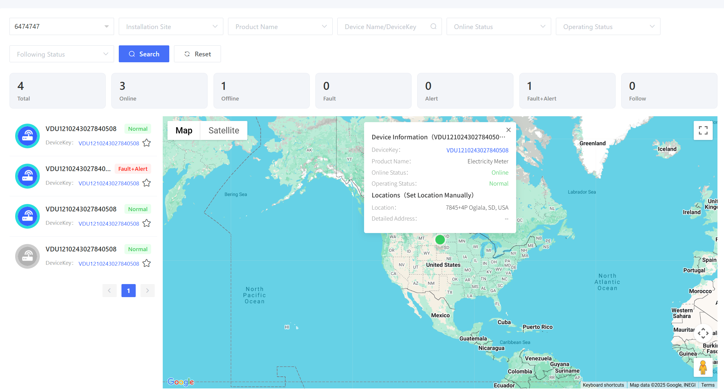 On the “Device” - “Device Map” page, you can get an overview of the number of devices and their exact location information. Click a device on the map to view the device’s basic information and live location.