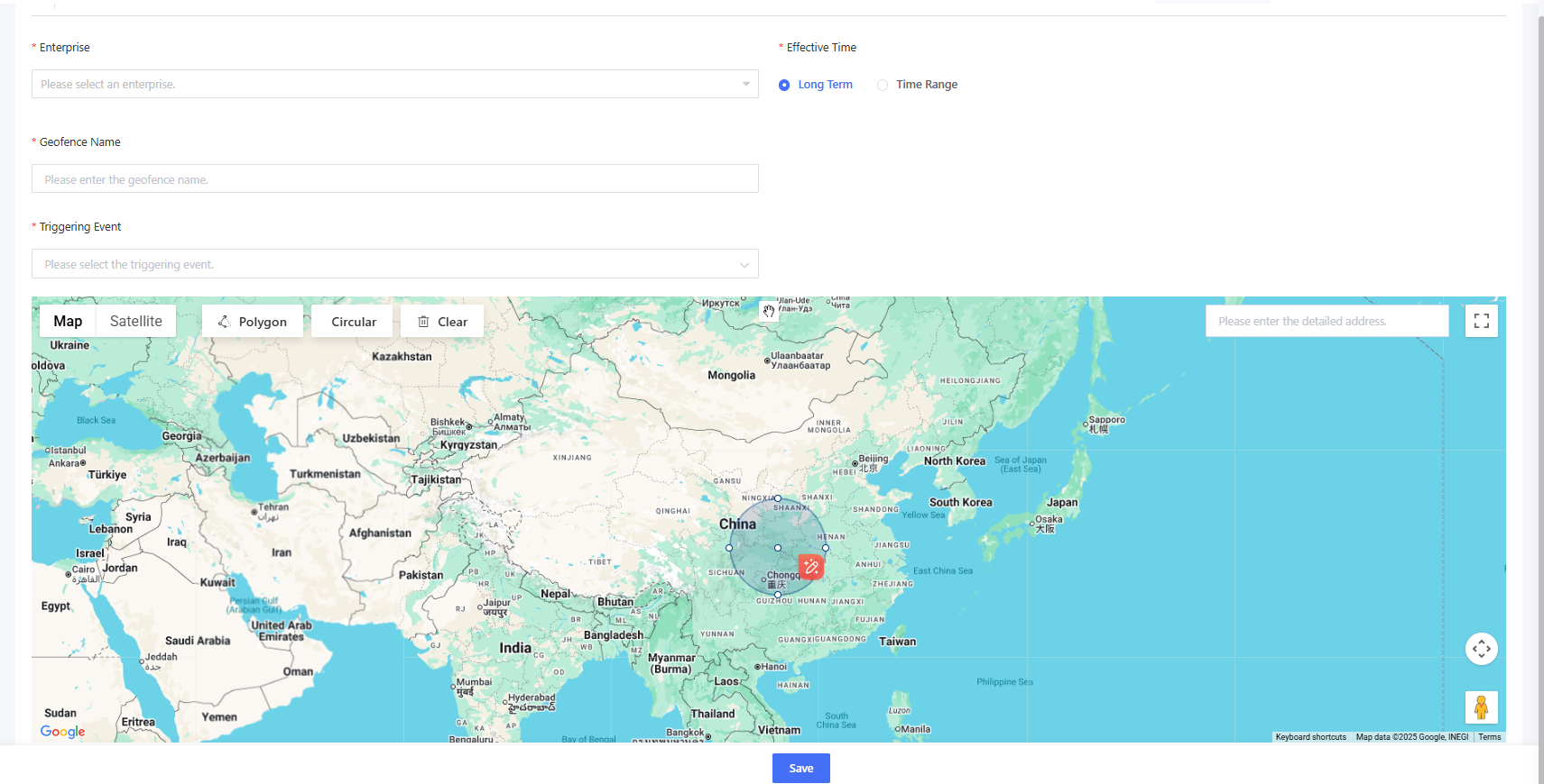 Click “Add” to enter the geofence adding page. Select the enterprise to which the geofence belongs, set the effective time of the geofence, enter the geofence name and triggering events, draw the boundary of the geofence, and click “Save”.