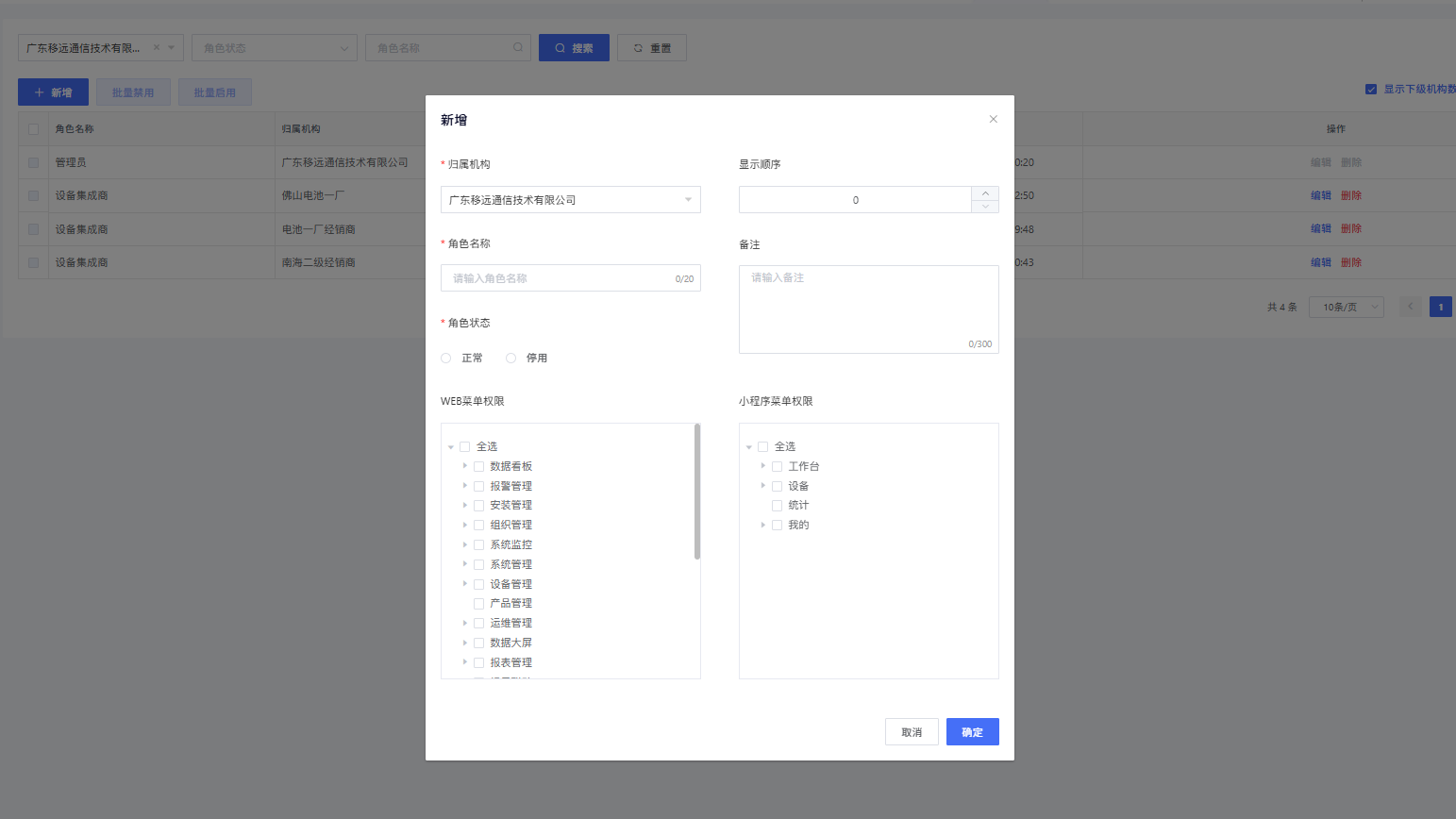 进入组织管理-角色管理,点击新增弹出新增角色弹窗,录入角色名称(如管理员、运维、安装人员等)、角色状态(默认正常,不再使用可选择停用)、配WEB菜单权限和小程序菜单权限(不同岗位可区分不同管理权限)即可新增角色