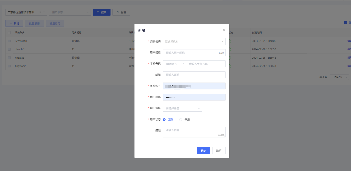 进入组织管理-用户管理,点击新增弹出新增用户弹窗,录入以下信息即可创建用户。