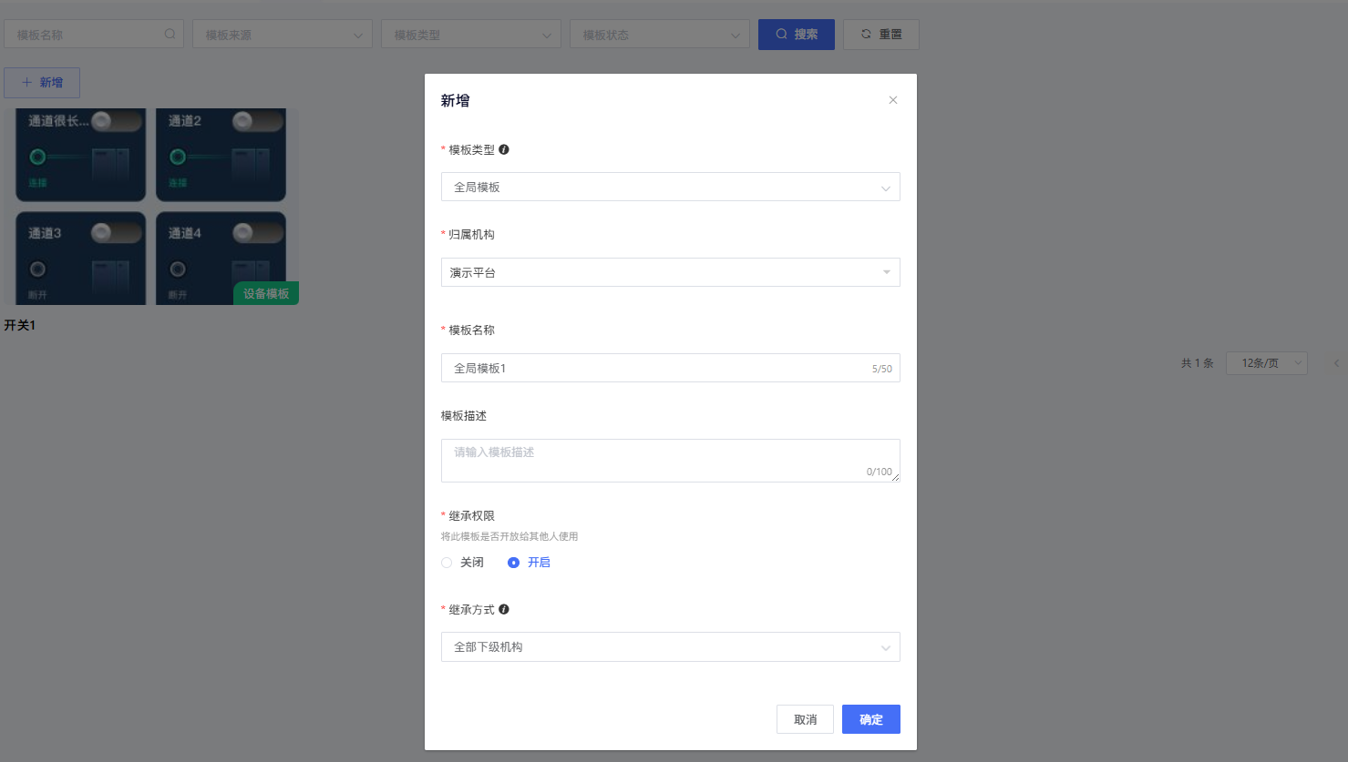 继承权限:权限开启后所选范围内的下级机构可使用您创建的模板。