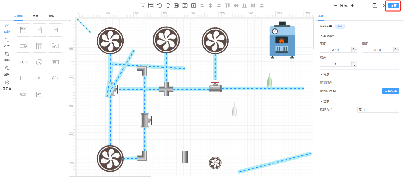 图形:提供一些拟真图形表达一些物理设备,图形也可以通过设备动态数据来展示对应的图形状态,如根据设备的水泵水量百分比来动态展示水泵状态。