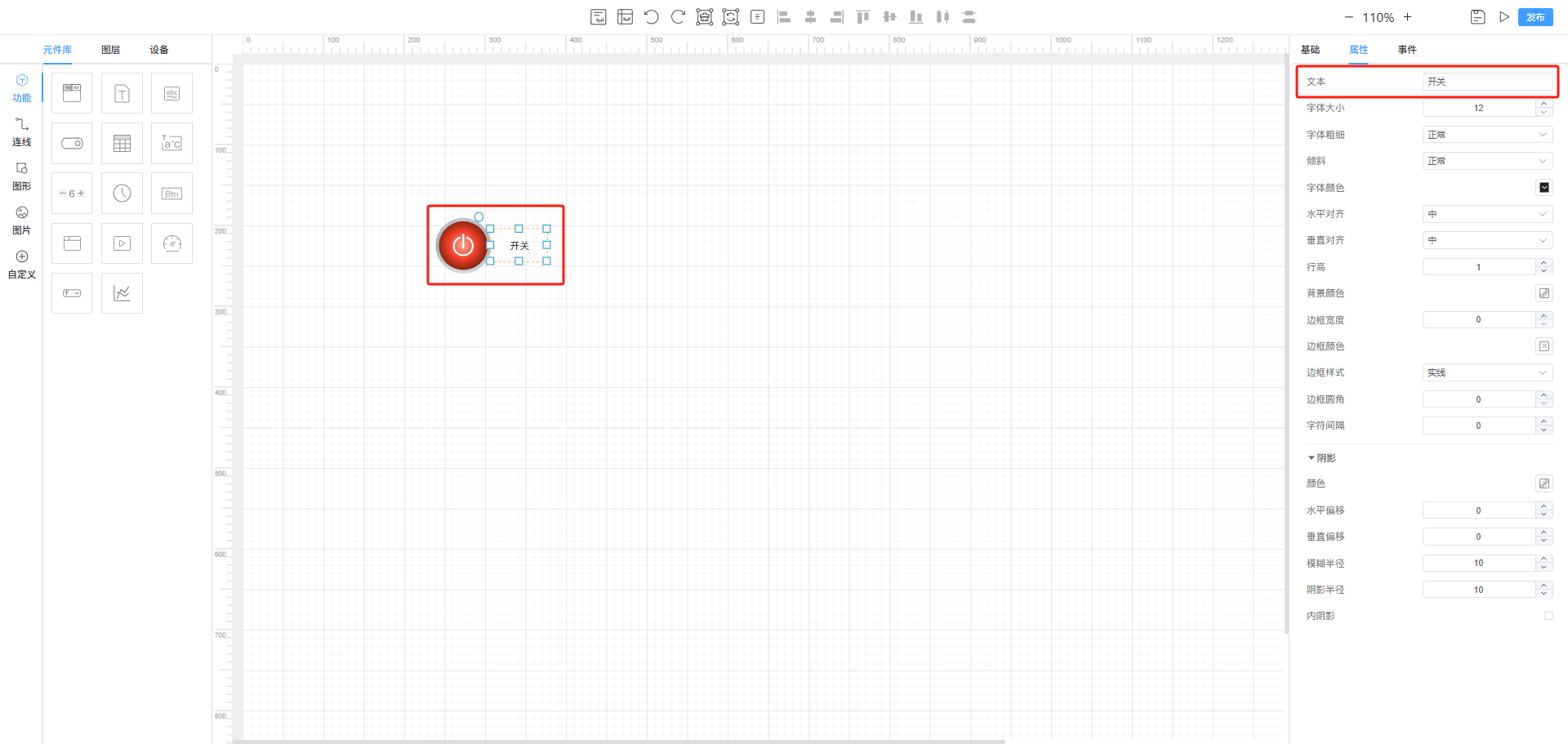 功能元件:主要用于展示不同类型的设备数据,如静态数据通常用于标识图形/图片等一些固定的字段,如标识这个图形是开关;动态数据通常用于展示设备的动态物模型数据。