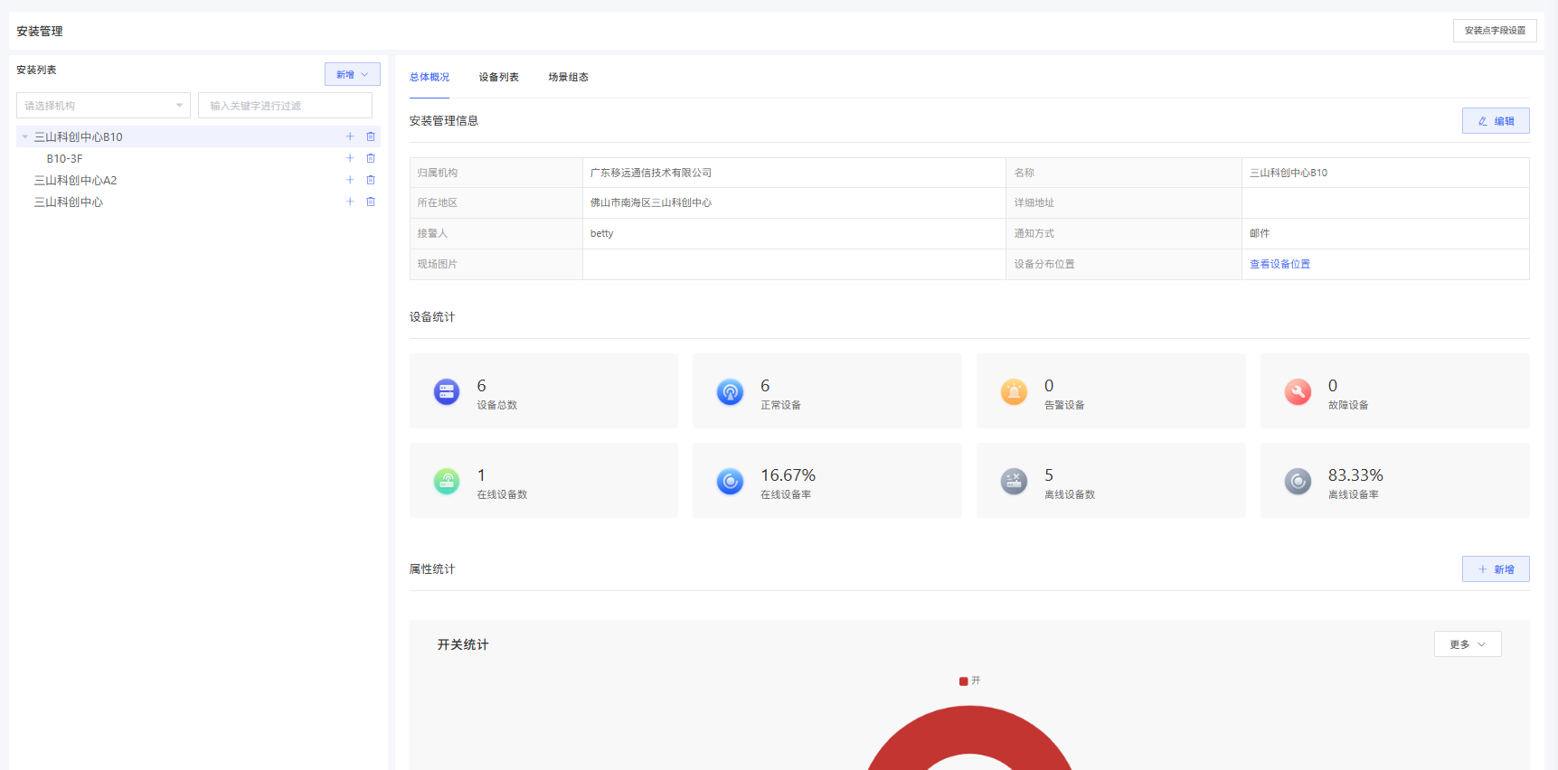 在总体概况模块,可总览该安装点的设备统计信息,支持自定义安装点下的属性统计图表;自定义图表添加方式可参考运行记录,配置参数类似。