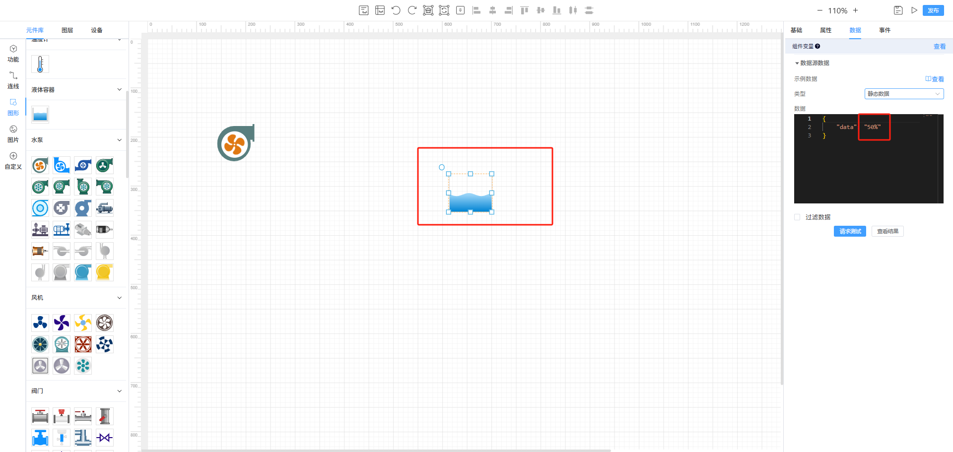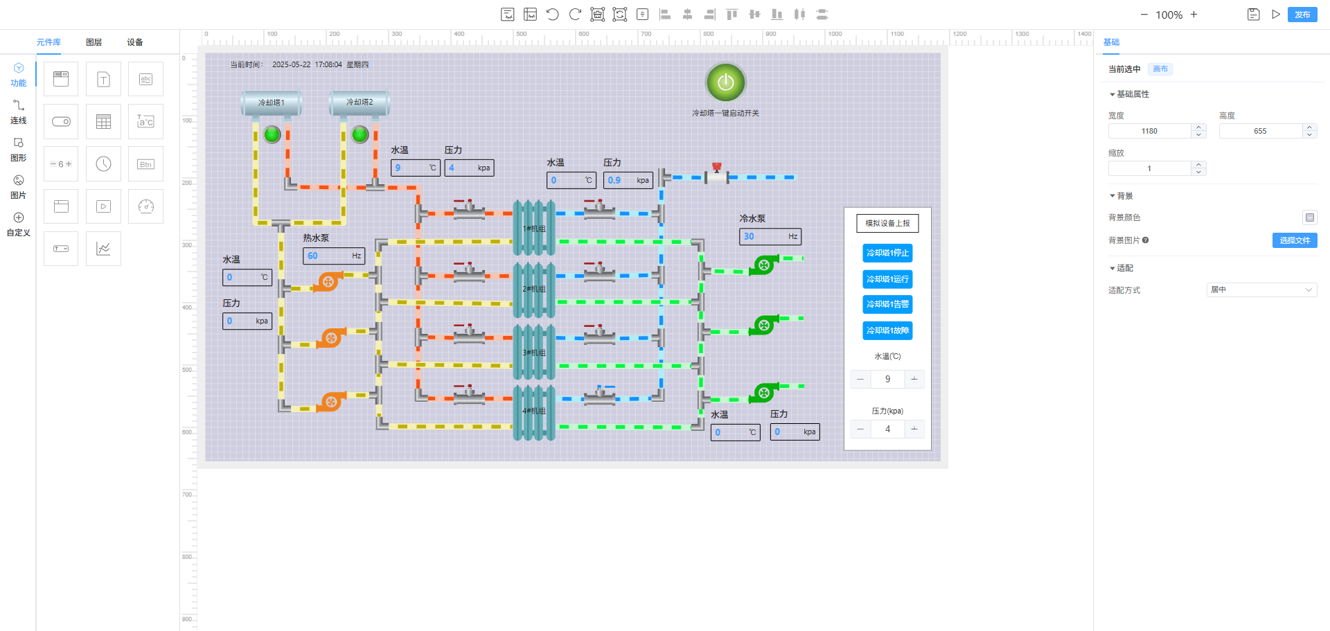图形:提供一些拟真图形表达一些物理设备,图形也可以通过设备动态数据来展示对应的图形状态,如根据设备的水泵水量百分比来动态展示水泵状态。