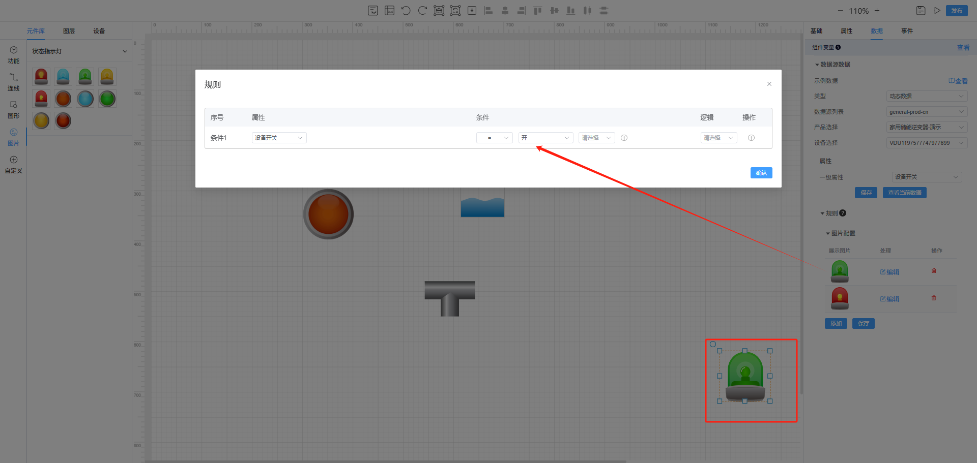 图片:提供一些状态指示灯图片,图片支持根据设备不同状态展示不同图片,如设备开启时展示绿灯图片,开关时展示红灯图片。
