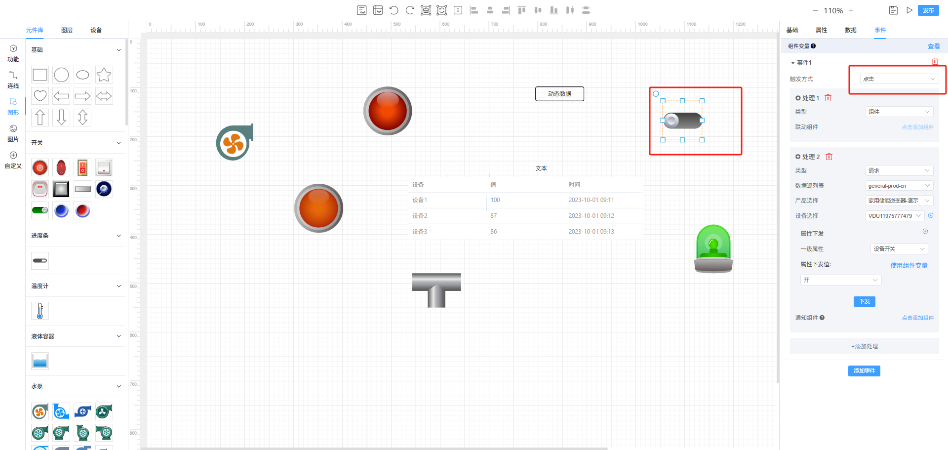 - 事件设置中可配置组件的点击/切换触发后执行的事件,如联动另一个组件,如下发某个指令给设备。
