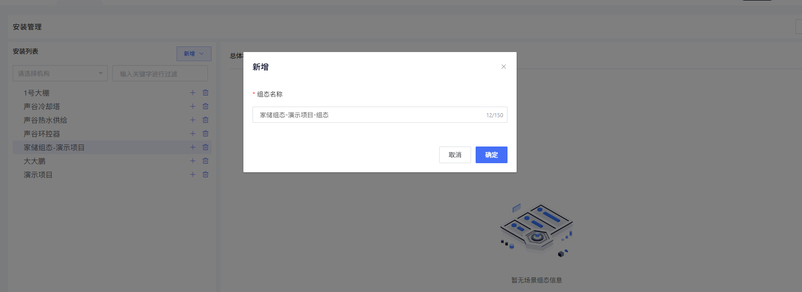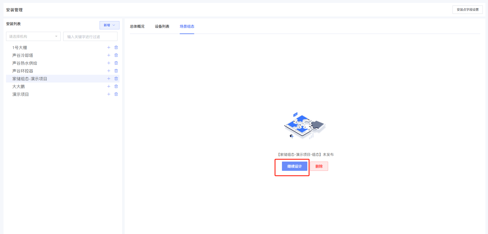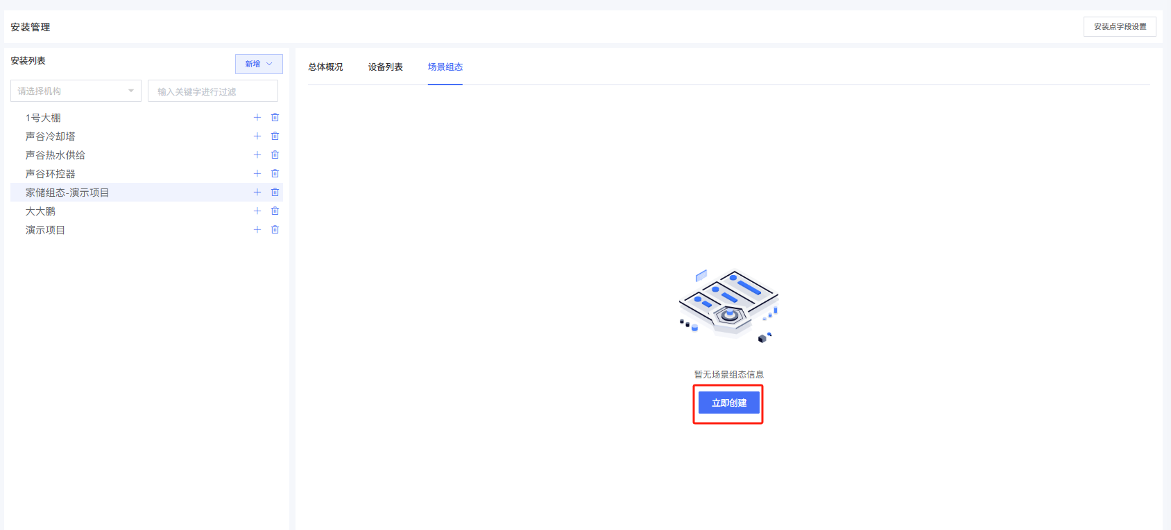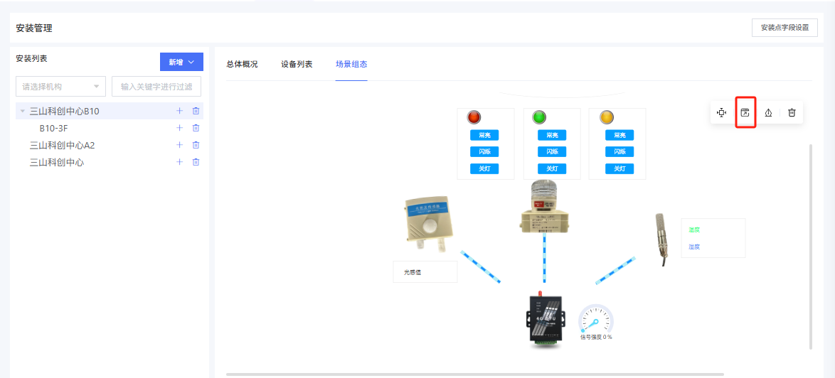 在场景组态点击创建场景组态,输入名称点击设计进入组态设计页面,可使用组态元件按需绘制安装点设备分布信息。