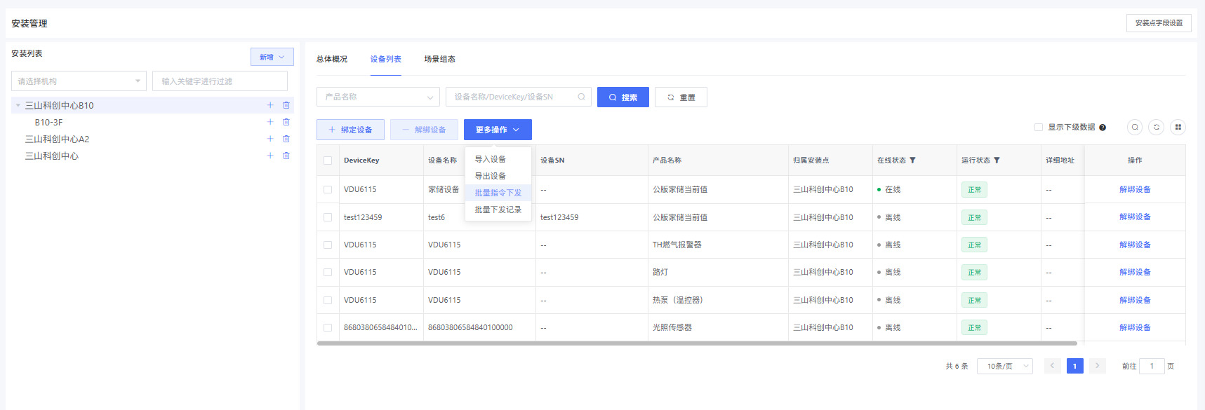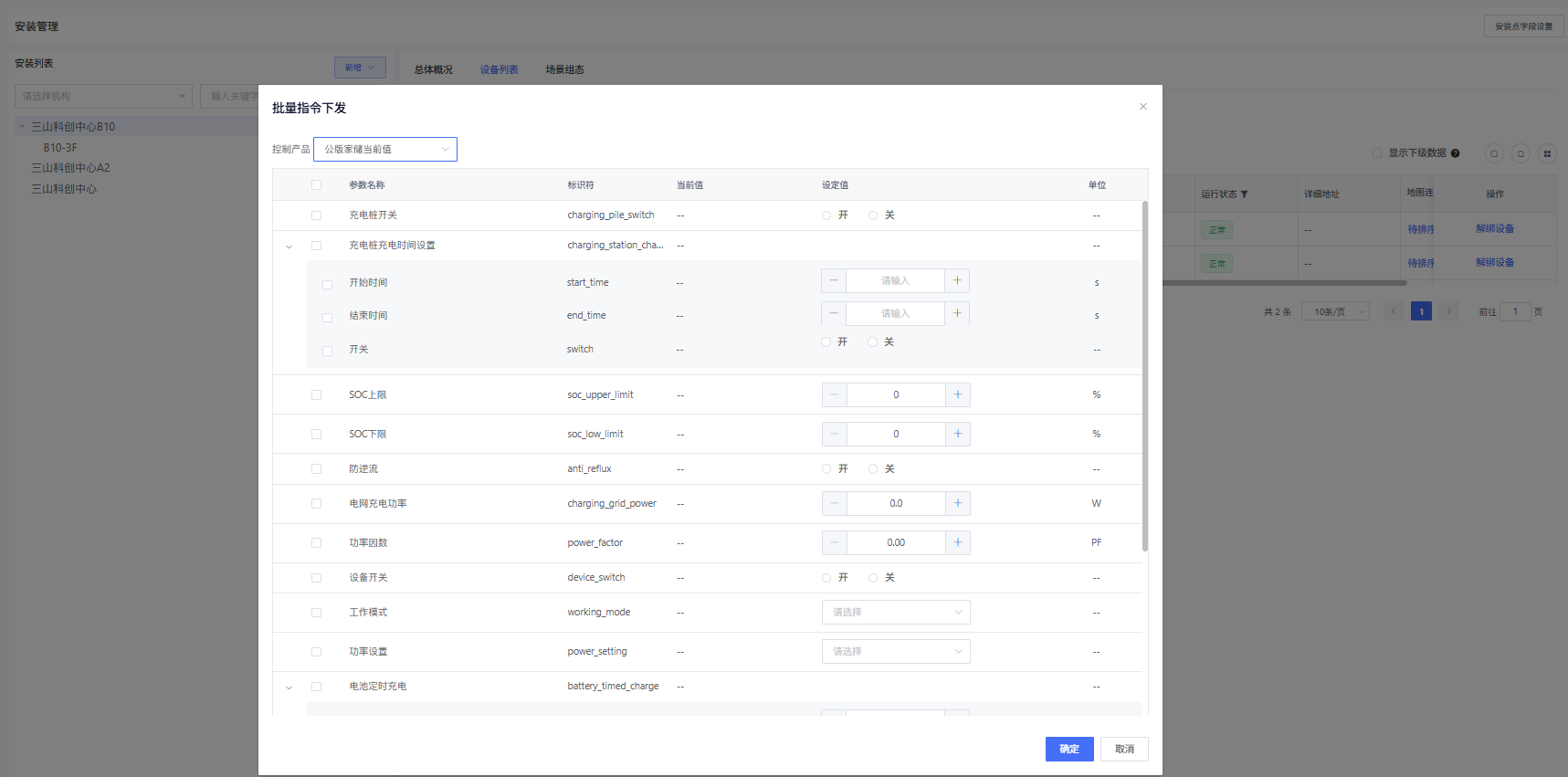 点击批量指令下发弹出弹窗,选择产品后可对该安装点下该产品设备进行批量控制,如开关。
