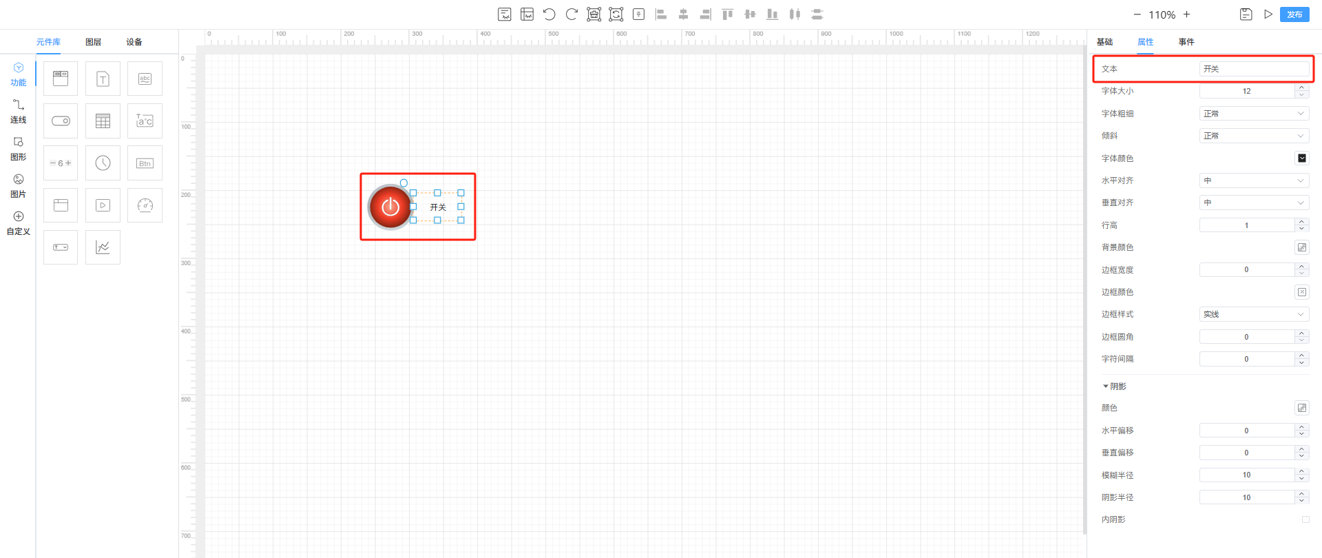 功能元件:主要用于展示不同类型的设备数据,如静态数据通常用于标识图形/图片等一些固定的字段,如标识这个图形是开关;动态数据通常用于展示设备的动态物模型数据。