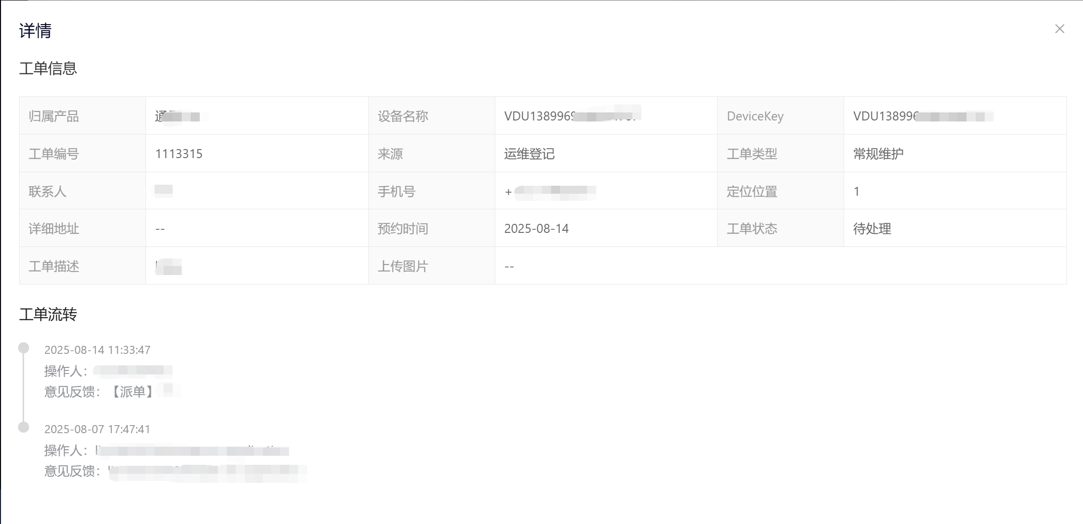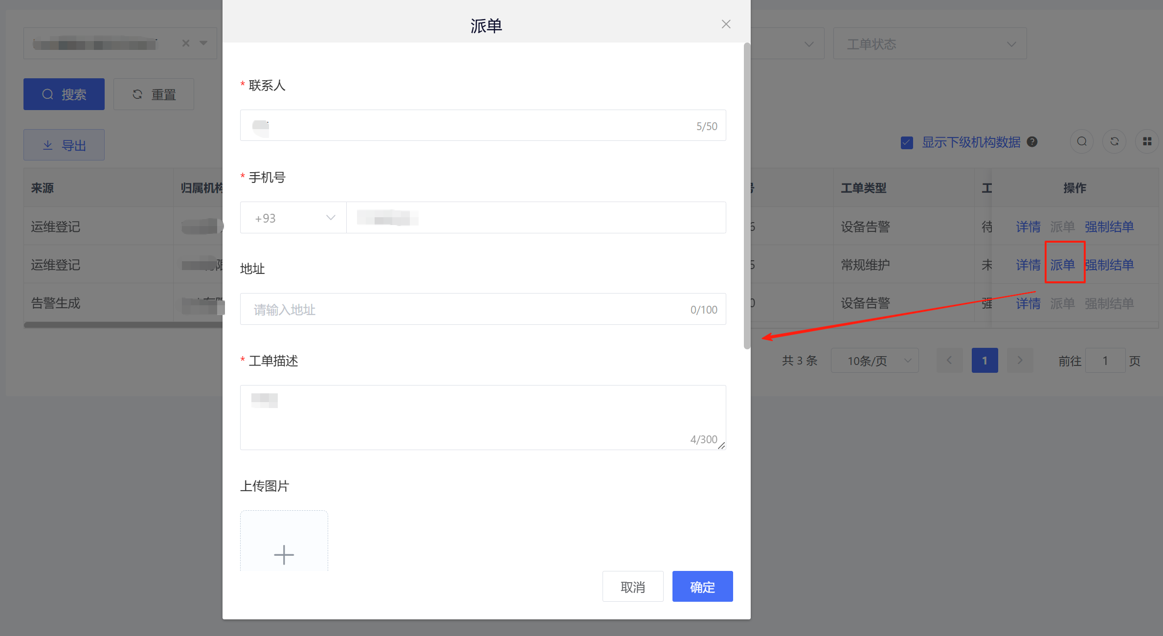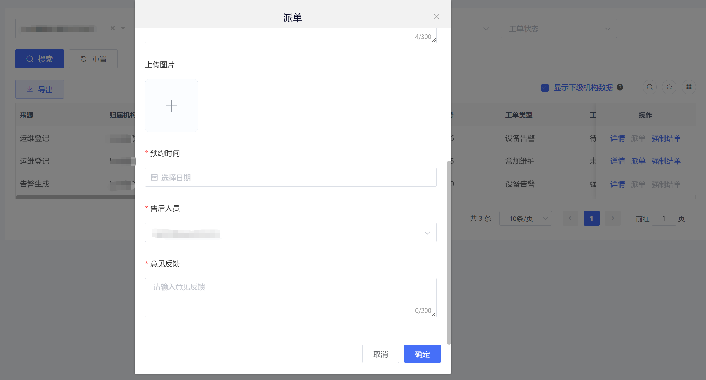 创建工单后可按实际情况将工单派给对应运维售后人员处理,点击派单弹出派单弹窗,弹窗将默认回显创建工单时的基本信息如工单联系人、联系电话、地址、工单描述、工单图片、预约时间等,若存在错漏也可在派单时更正这些信息。在这些信息基础上需要选择派单给哪个售后人员及填写对应的派单意见。