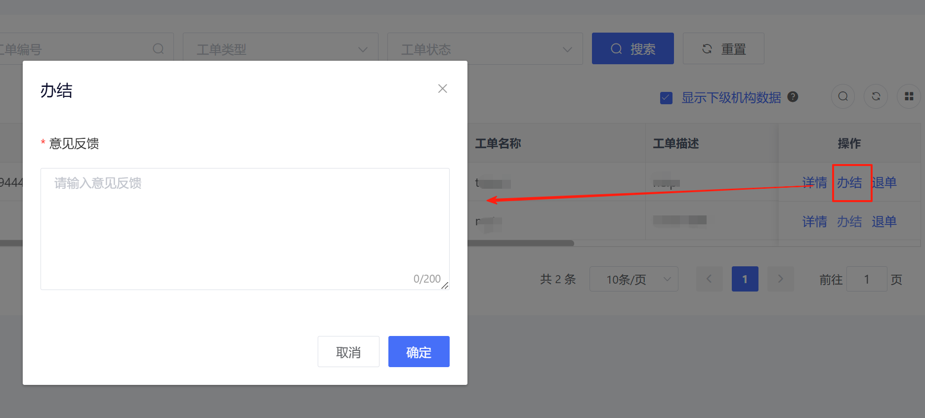 售后人员执行工单完毕后可点击办结,输入办结的反馈如解决方案/结果等后可办结此工单