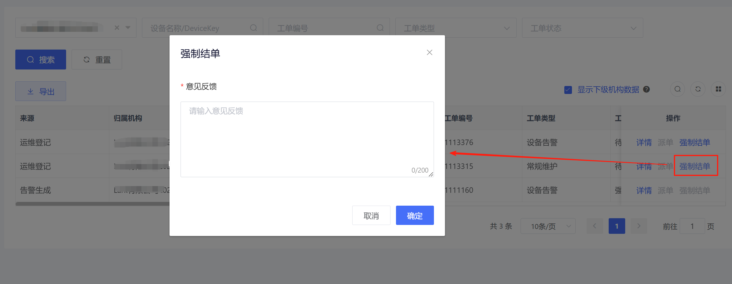 创建工单后由于计划有变不再需要执行工单的情况,可点击强制结单输入相关信息后结束此工单。此外,还有如下几种情况将产生强制结单: