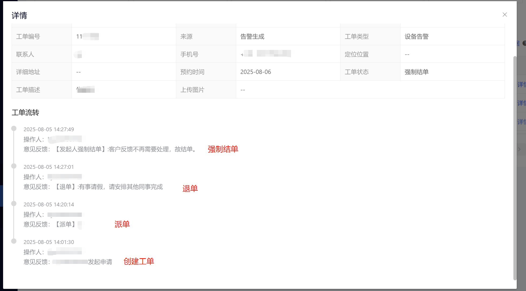 确认派单后,工单详情将增加一条工单派单流转信息,如下图