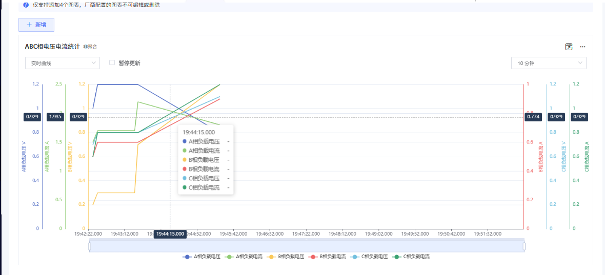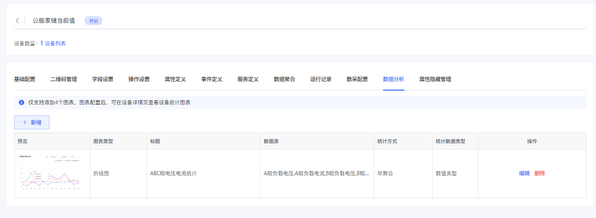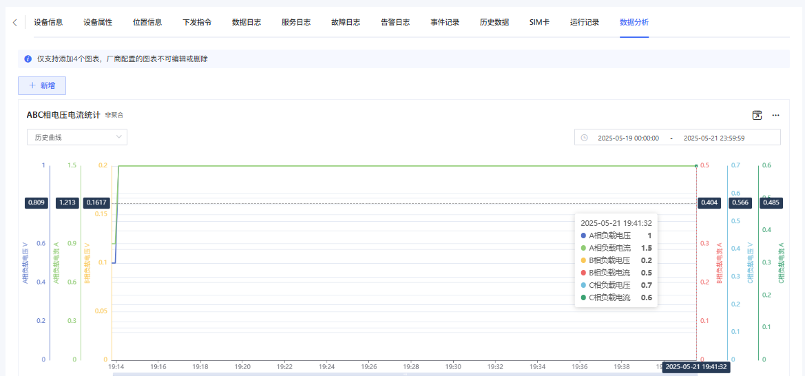 完成后可在每个设备详情页-数据分析查看按设备数据生成的数据分析图表,支持切换实时曲线/历史曲线,