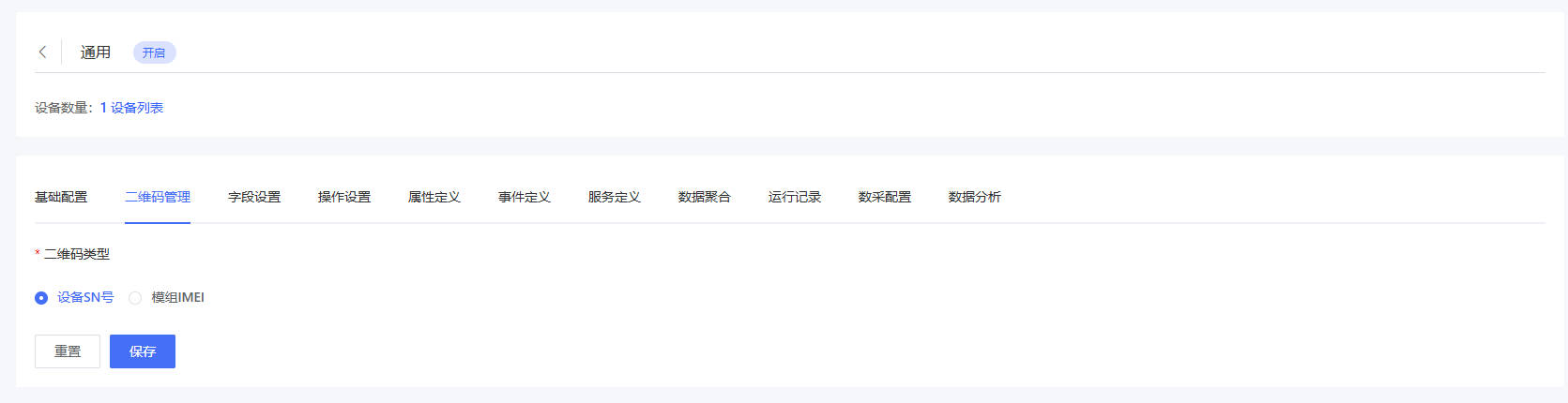 资产管理SaaS文档中心 用于配置该产品的设备二维码采用哪种格式,二维码格式影响【移企物联】小程序扫码绑定设备功能,蜂窝产品可选SN二维码/模组二维码,WiFi产品仅支持SN二维码。