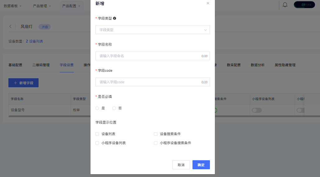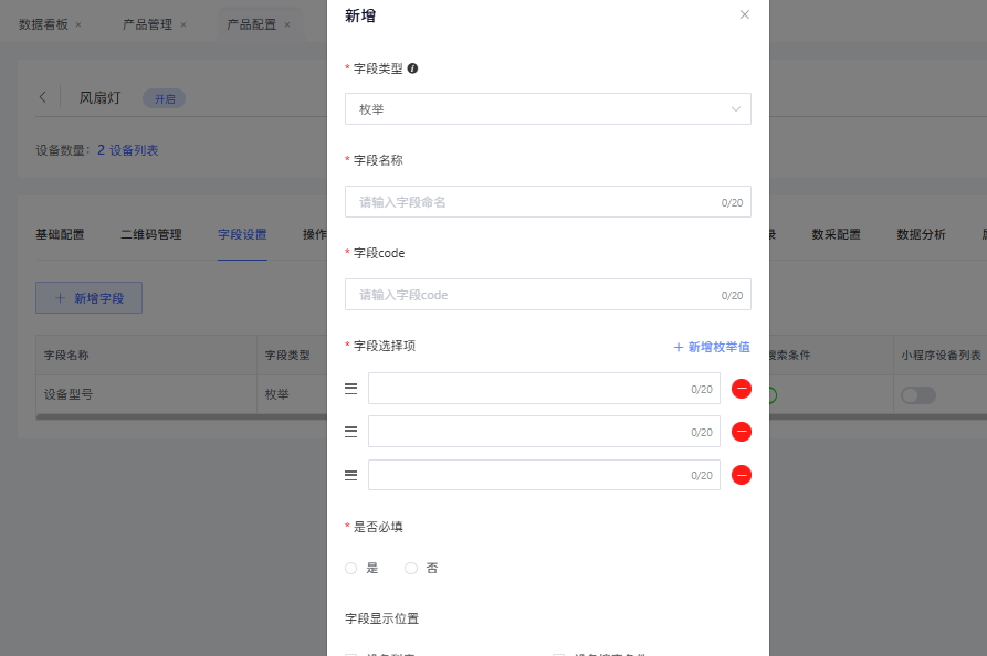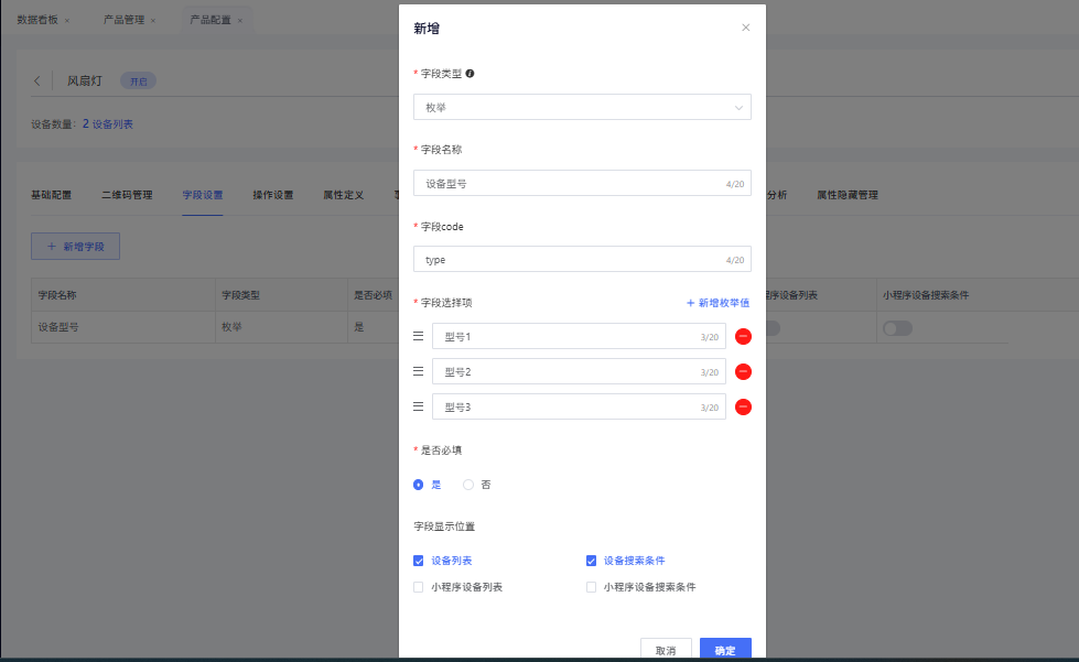 字段显示位置:用于配置此字段是否在设备列表/搜索条件中显示。