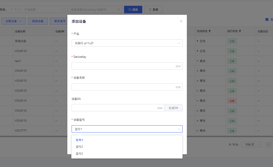 创建后添加设备/导入设备时将增加设备型号的字段:
