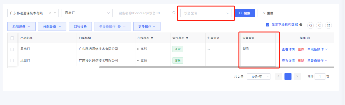 在设备列表选中该产品后将在设备列表和设备搜索条件展示该字段: