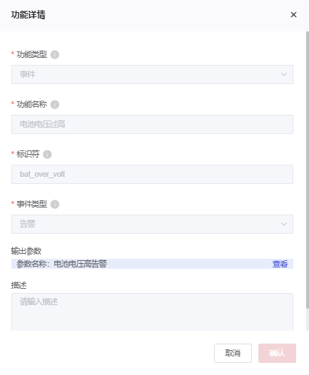 通常的物模型为配置告警事件带上告警状态的输出参数,如下图: