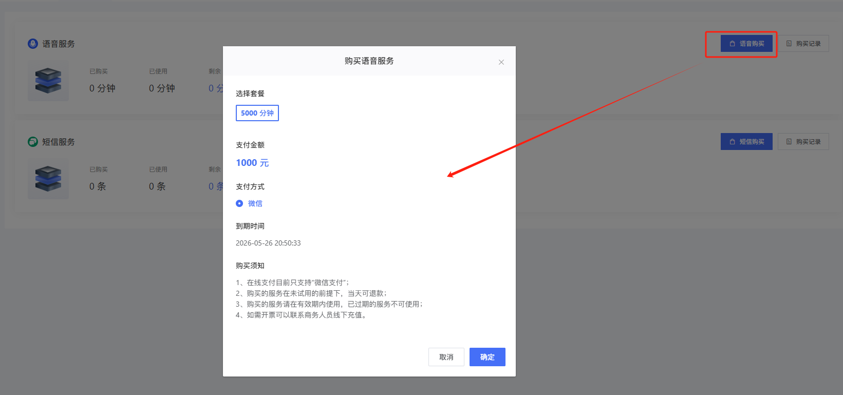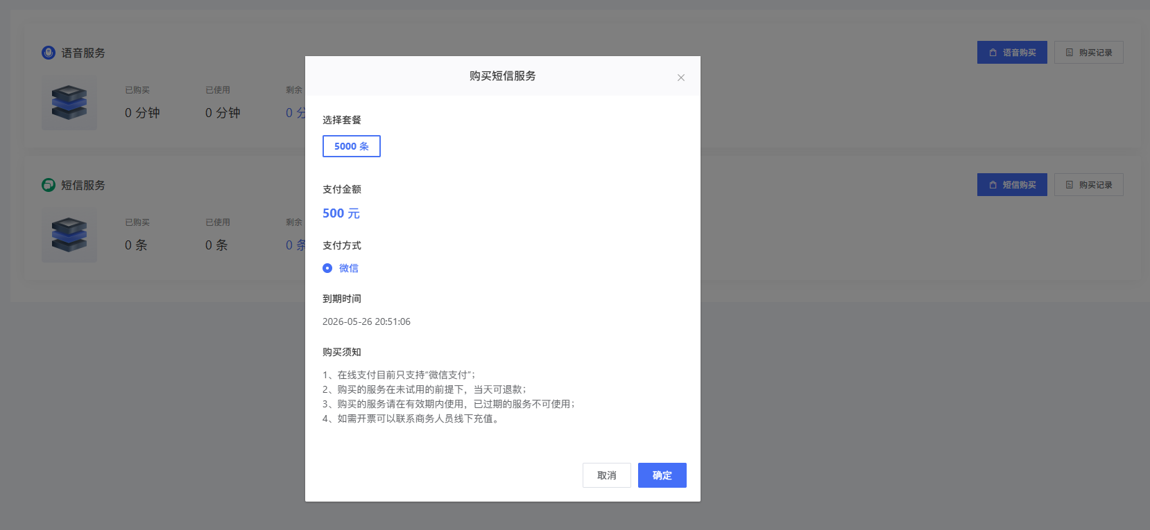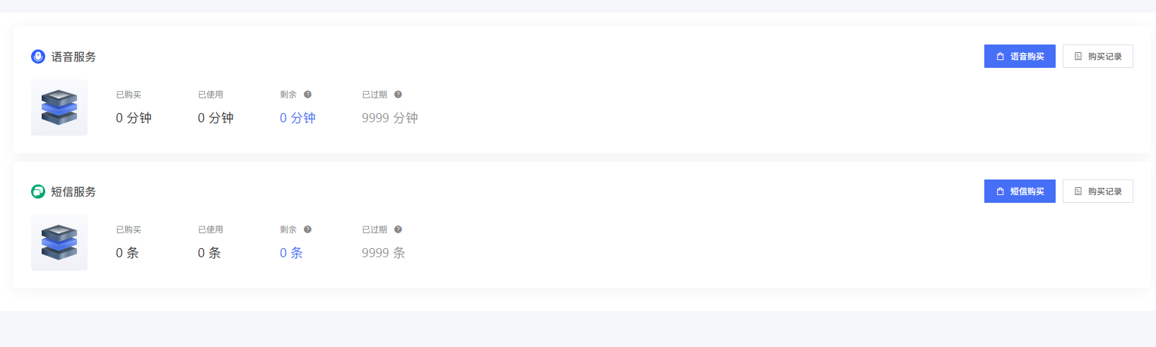 在资费管理-短信语音服务可查看短信和语音服务的购买量、使用量、剩余量和已过期量。点击购买可购买官方语音/短信用量。购买后企业账户将刷新对应数量。
